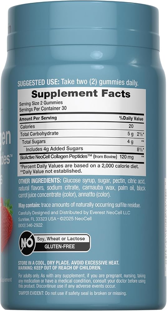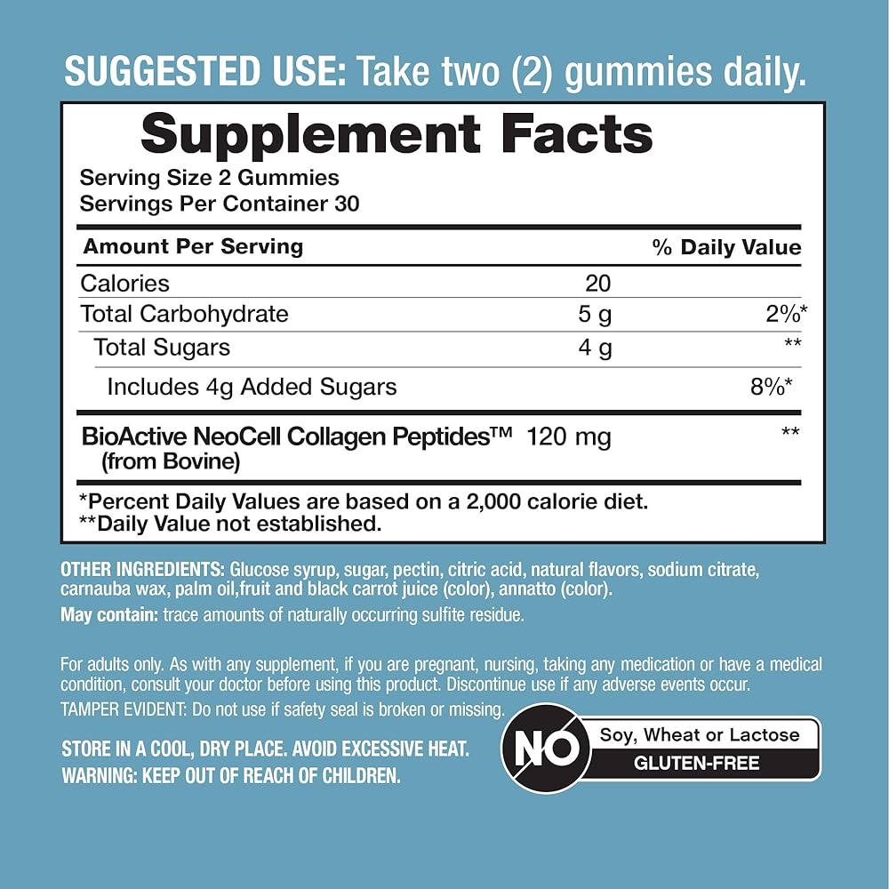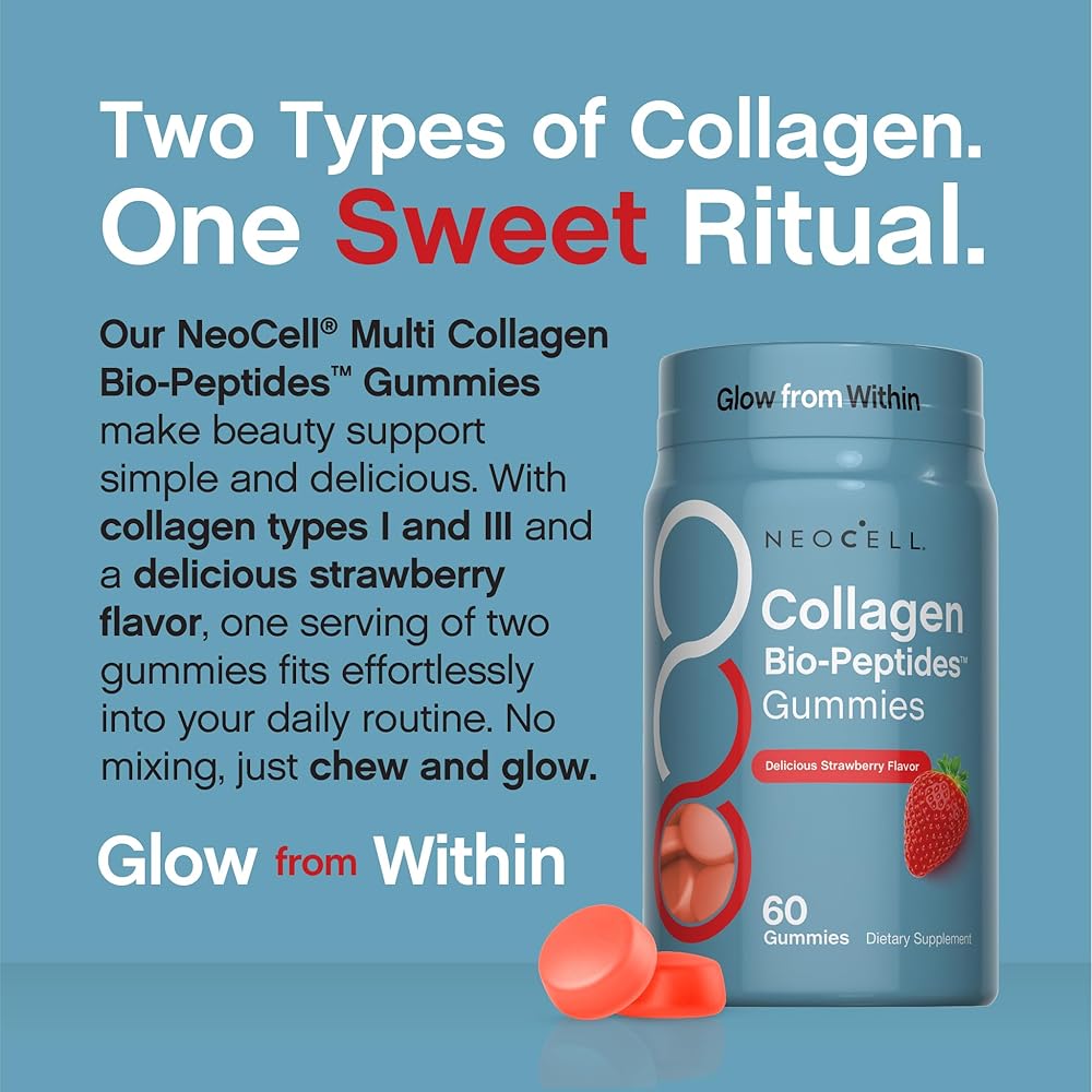 Glow from Within Daily collagen is made deliciously simple with NeoCell Collagen Bio-Peptides Gummies. Each serving 120 mg of BioActive NeoCell Collagen Peptides Types I and III from bovine. Plus, our collagen is formulated for better absorption.** Delicious Gummies Our thoughtfully designed formula supports your beauty from within. Best of all, they're in delicious strawberry-flavored gummies that can be taken anywhere. A wonderful alternative for those who dislike or have trouble swallowing pills, these gummies are fun, convenient, and tasty! Beauty, Simplified This product is designed to illuminate your inner beauty in a way that stands the test of time.* At home or on the go, these gummies are a fun and convenient way to support radiant beauty in a formula that is free of gluten, soy, wheat, and lactose. *This statement has not been evaluated by the Food and Drug Administration. This product is not intended to diagnose, treat, cure, or prevent any disease. **Compared to non-enzymatically treated gelatin.