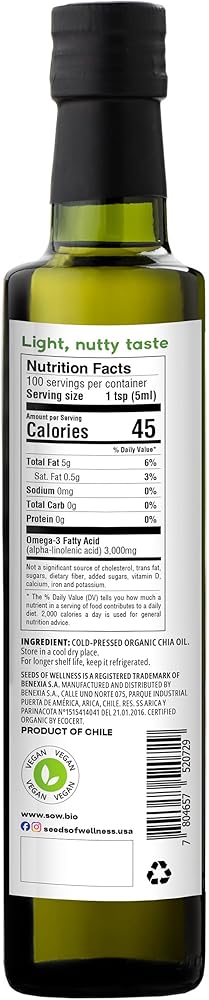 SOW SEED OF WELLNESS - ORGANIC CHIA SEED OIL is produced by cold-pressing organic, high quality Chia Seeds from our own regenerative farms located in South America. SOW Organic Chia Seed Oil is a great source of plant-based Omega-3 essential fatty acids. With a high 60% concentration of Omega-3, this oil contains 3,000 mg per tsp (5 ml) serving, more than doubling the necessary daily dosis in a single serving. This extra-virgin, pure organic Chia seed oil has a smooth and silky mouthful, light texture, delicate nutty flavor with a taste sensation of seeds, and a clear golden color. Extremely versatile, Sow Organic Chia Seed Oil has a wide variety of culinary uses; from dressing fresh vegetables and salads to empowering nutritious smoothies.