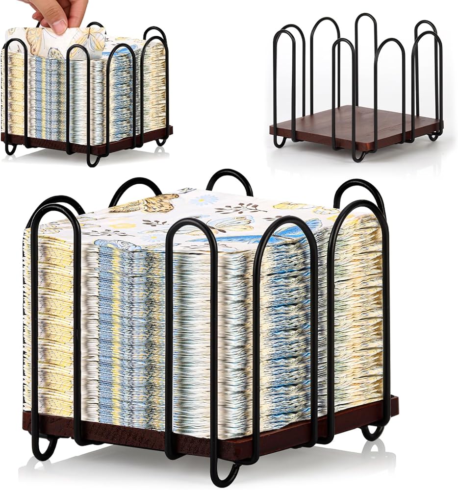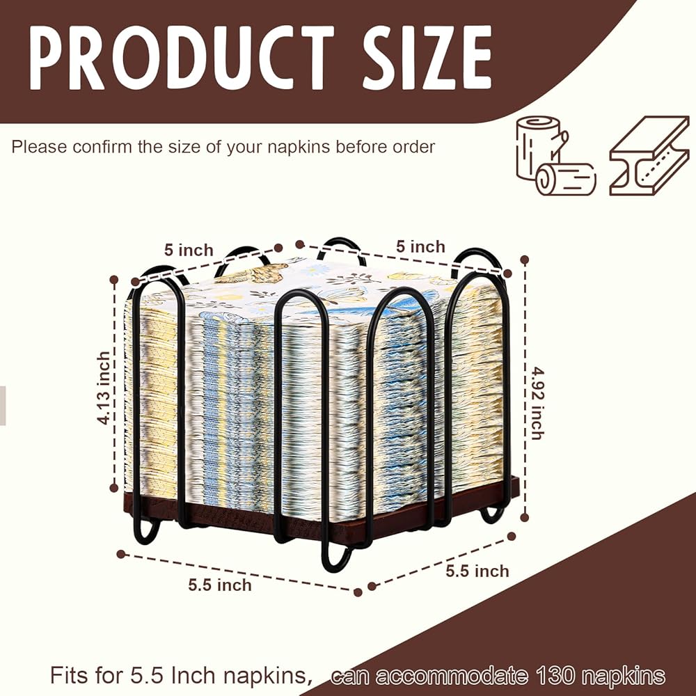1.Cocktail Napkin Holder:Our flat napkin dispenser features an exterior size of 5.5 x5.5 x 4.92 inches, with an inner height of 4.13 inch. Flat napkin dispenser is crafted from a combination of metal and solid pine wood, crafted from thick-gauge steel wire, it is highly resistant to bending. The smooth welds will not pierce or tear paper napkins.. This design allows you to reuse the dispenser time and time again, making it perfect for all your entertaining needs from casual dinners to larger gatherings.