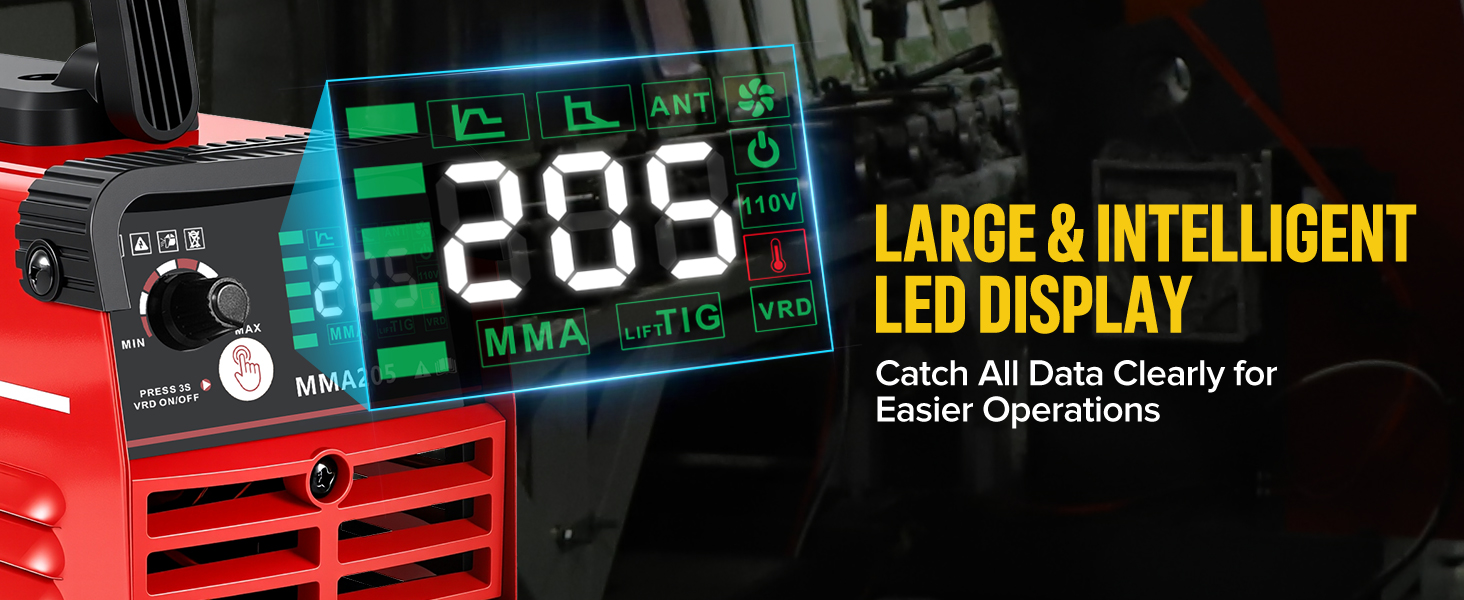 【𝐇𝐨𝐭 𝐒𝐭𝐚𝐫𝐭, 𝐀𝐫𝐜 𝐅𝐨𝐫𝐜𝐞, 𝐀𝐧𝐭𝐢-𝐒𝐭𝐢𝐜𝐤 & 𝐕𝐑𝐃 𝐅𝐮𝐧𝐜𝐭𝐢𝐨𝐧𝐬】welder features hot start and arc force, is easy to ensure quick arc ignition, stable arc, smoother welding even with voltage fluctuation. Automatic anti-stick avoids rod sticking in the molten pool.maquina de soldar portatil built-in protection (Over-Voltage/Current/Heat/Load) plus a high-power cooling fan guarantee safe operation and extend machine lifespan. Upgrade VRD function ensures user safety, specially for welding beginners.