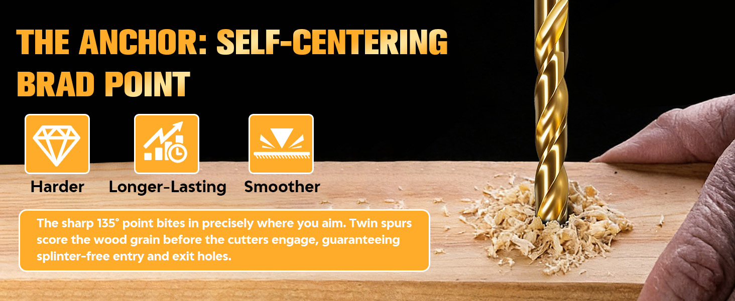 【Precision Brad Point for Clean, Accurate Holes】 The self-centering brad point tip starts drilling exactly where you aim, preventing wandering. It scores the wood grain cleanly for splinter-free, professional-quality holes on both entry and exit sides in various woods.