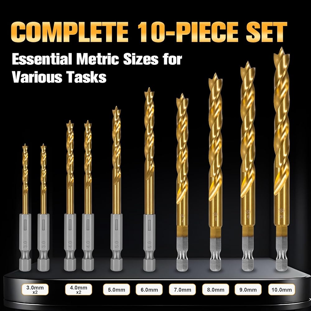 【Practical 10-Piece Metric Size Set】 This set includes 10 essential metric sizes (3, 3, 4, 4, 5, 6, 7, 8, 9, 10mm) to cover a wide range of common tasks like doweling, furniture making, and DIY repairs. The hex shank allows for quick, tool-free changes in most power drills.
