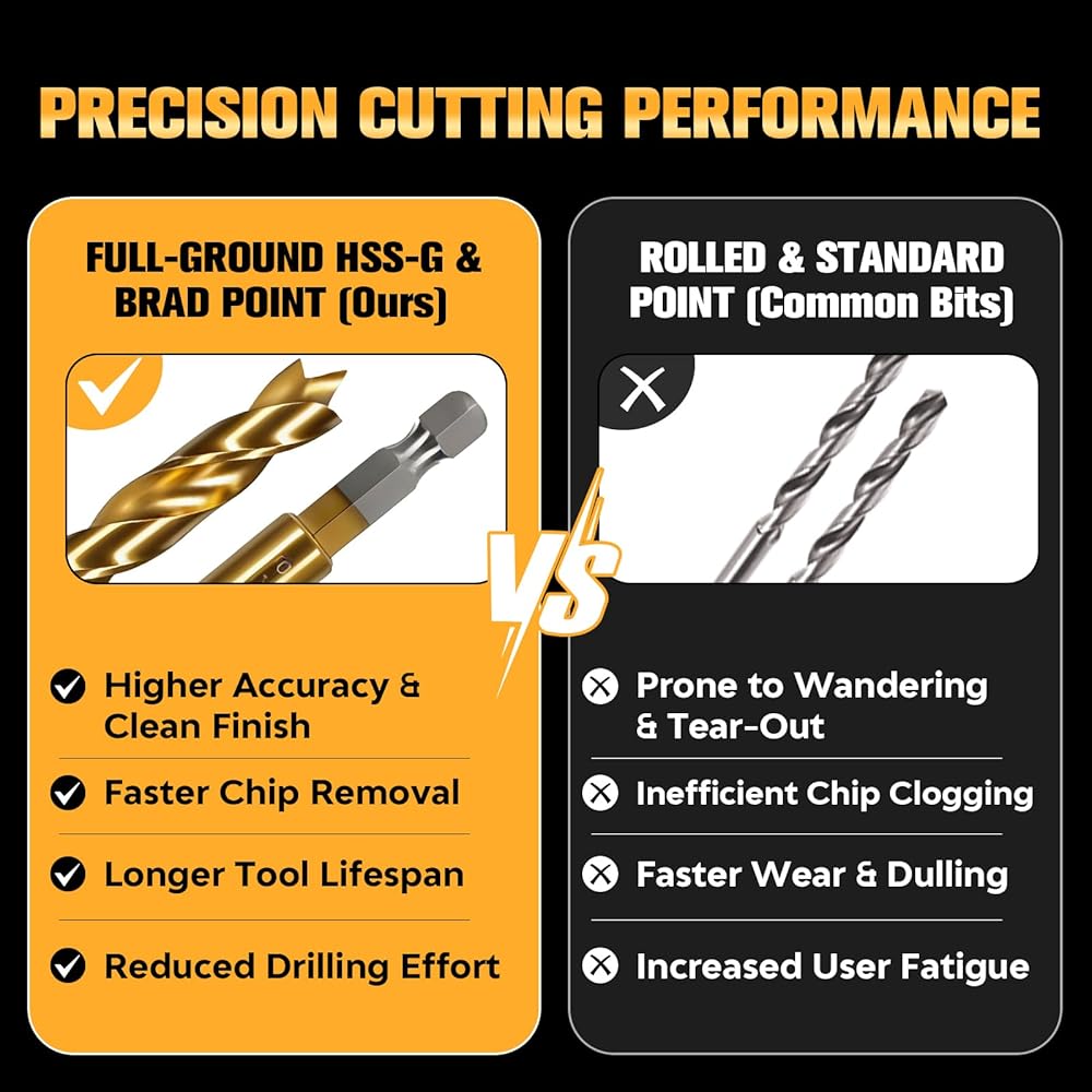 【Premium HSS-G & Full Ground Construction】 Crafted from high-grade HSS-G steel and fully ground for superior strength and heat resistance. These bits ensure exceptional durability and smoother, more efficient drilling compared to standard bits, making them ideal for demanding woodworking projects.