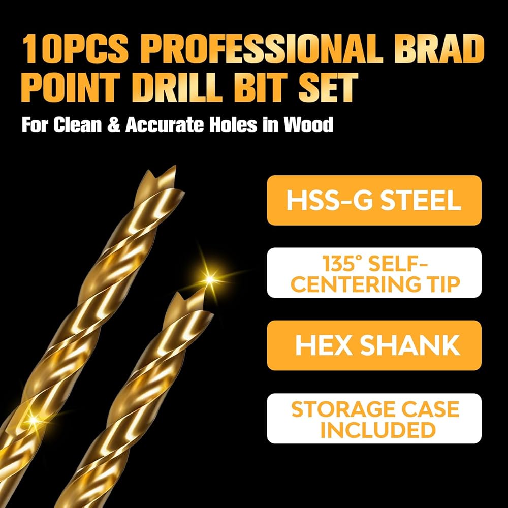 10Pcs Hex Shank HSS-G Brad Point Wood Drill Bit Set, Double Flute for Fast Drilling, Professional for Hardwood, Softwood & Plywood, Metric Sizes (3-10mm) with Storage Case