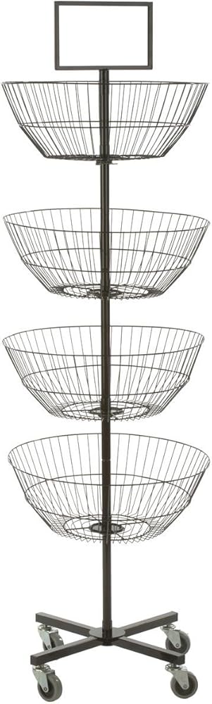 This free standing basket shelf unit has 4 tiers with baskets that provide ample space for storage. Each basket has a 21.9" diameter and 8" depth/height, with 5" of clearance between each basket. The entire unit stands at 73.1" tall, for a high visibility display! On the top of this shelf unit is a double sided sign holder, which holds a 10"W x 6"H insert. This basket shelf is portable and mobile, thanks to 4 heavy duty caster wheels. 2 caster wheels lock, which keeps the shelf securely in place when in use. The baskets are made from steel wire and the stand column and base are made from steel. Please note that minor assembly is required. Overall dimensions: 22.5"W x 73.1"H x 22.4"D. Weight: 19 lbs.