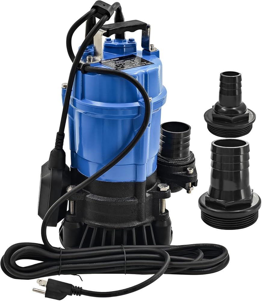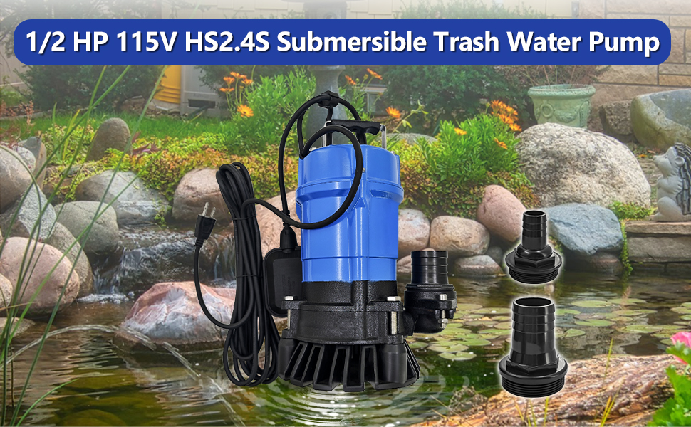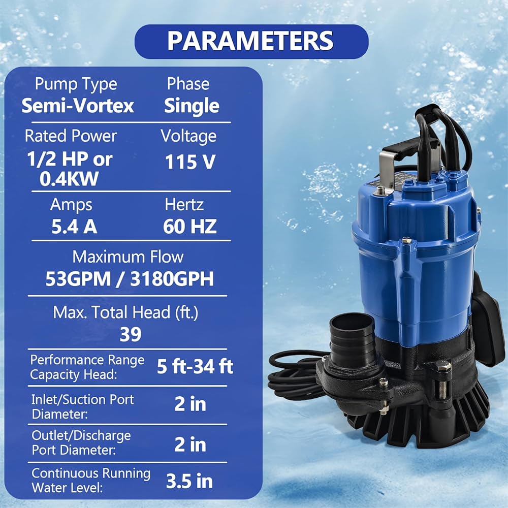 【PACKAGE LIST & SPECIFICATION】 1 Pcs x Electrical Submersible Wastewater Pump; Pump Type: Semi-Vortex; Phase: Single; Rated Power: 1/2 HP or 0.4KW; Voltage: 115 V; Amps: 5.4 A; Hertz: 60 HZ; Maximum Flow: 53GPM / 3180GPH; Max. Total Head (ft.): 39; Performance Range Capacity Head: 5 ft-34 ft; Inlet/Suction Port Diameter: 2 in; Outlet/Discharge Port Diameter: 2 in; Continuous Running Water Level: 3.5 in