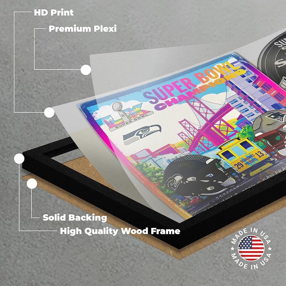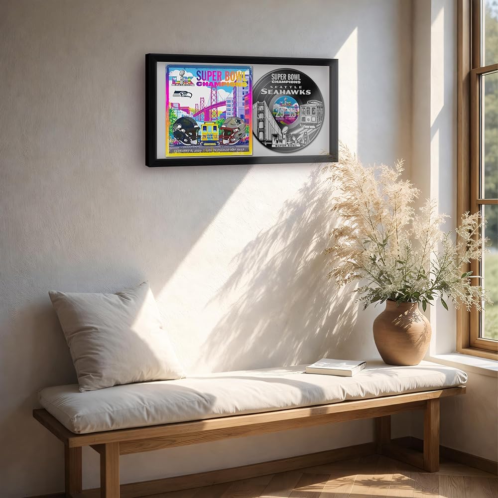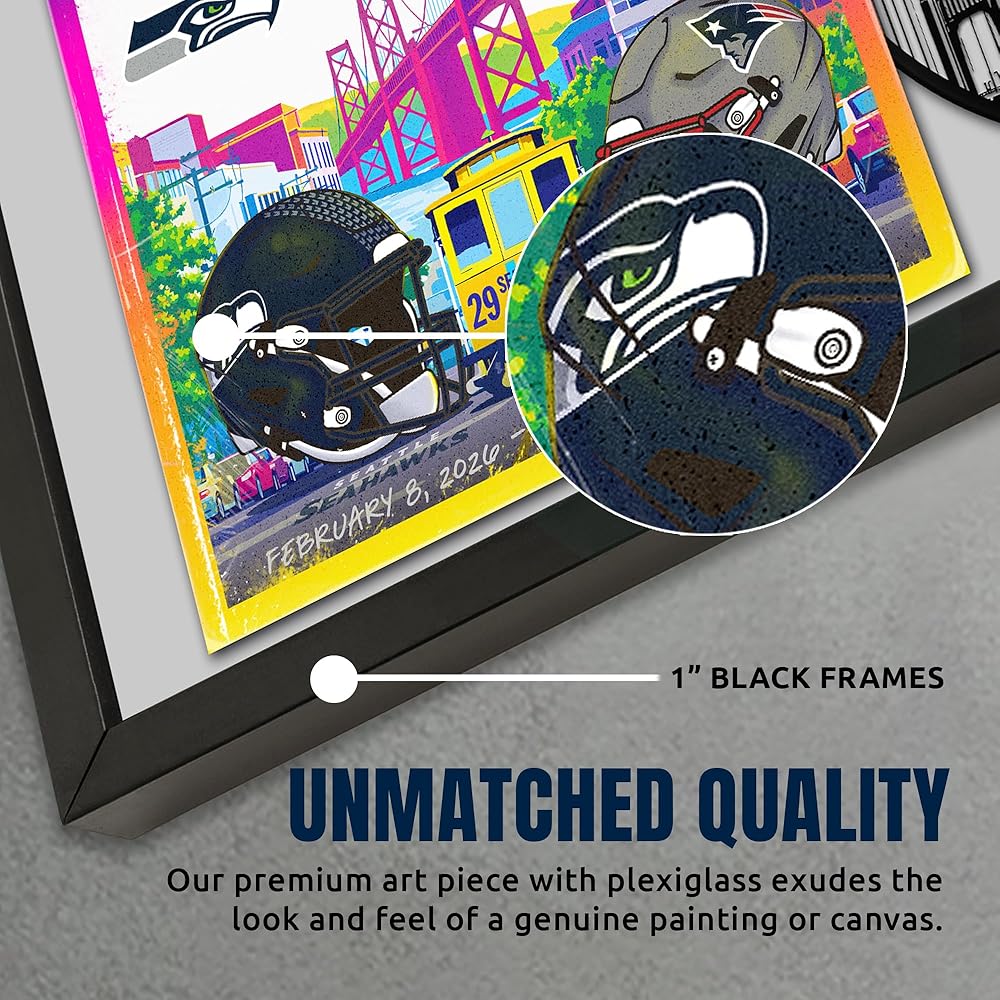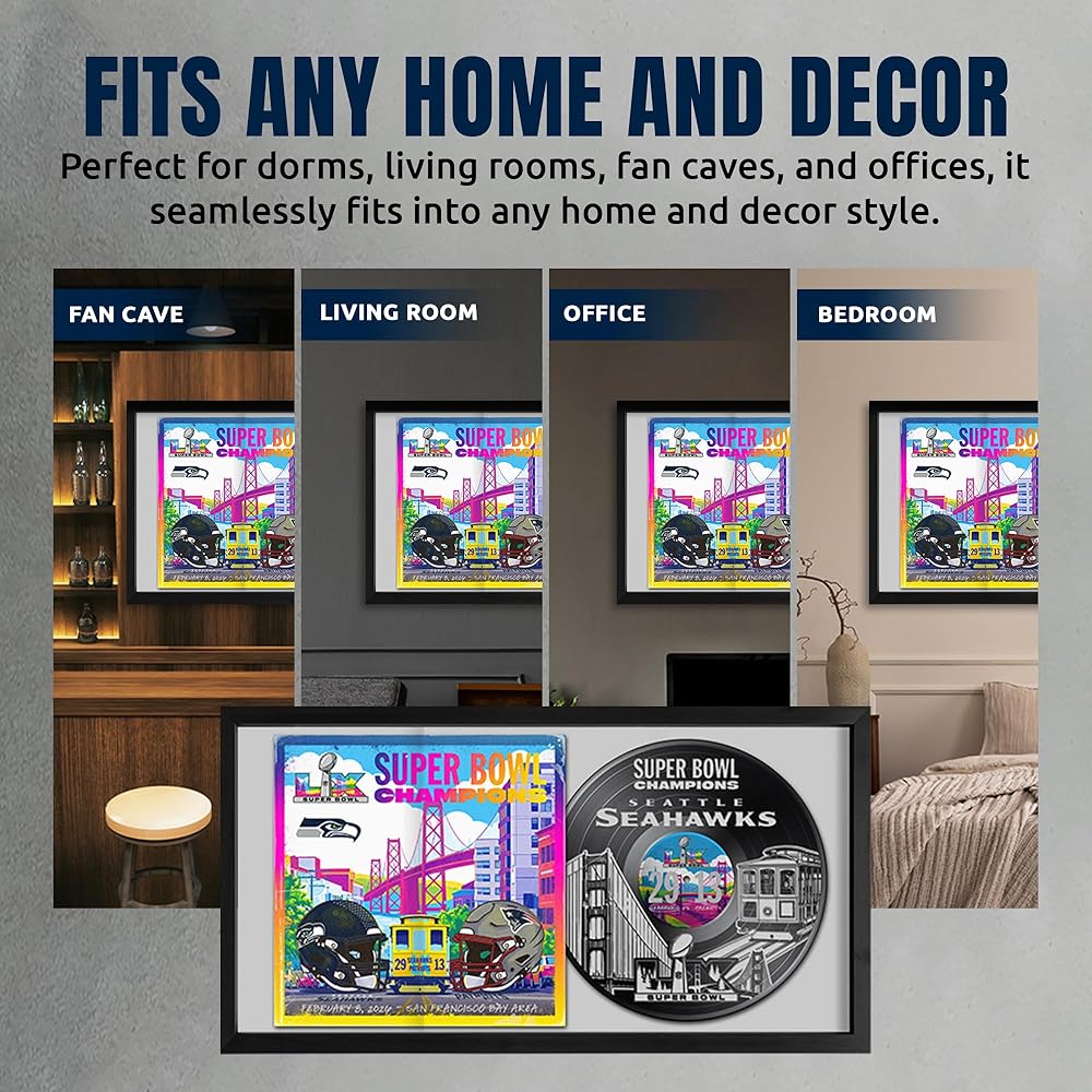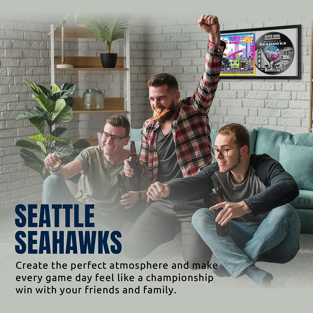This vinyl album framed art print celebrates the 𝗦𝗲𝗮𝘁𝘁𝗹𝗲 𝗦𝗲𝗮𝗵𝗮𝘄𝗸𝘀 as Super Bowl 60 champions. The design pairs a vibrant Super Bowl themed album cover with a detailed vinyl record style graphic. The 14 x 26 horizontal layout fills wall space above desks, couches, or entertainment areas. A black frame completes the presentation and supports long term display. Official NFL licensing ensures authentic team representation and championship recognition. This framed vinyl album print serves as a standout decor piece and a meaningful gift for dedicated Seahawks fans.