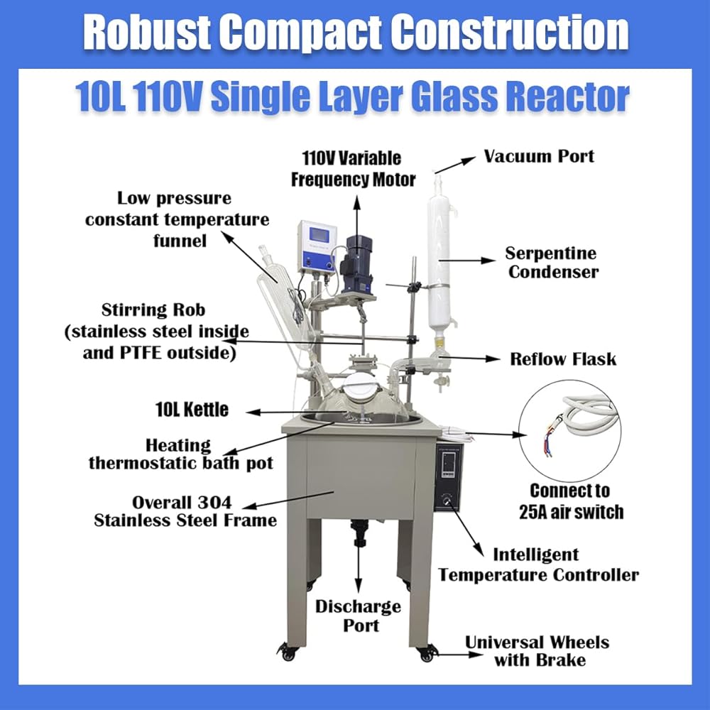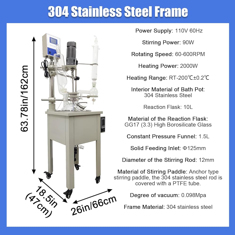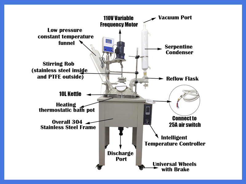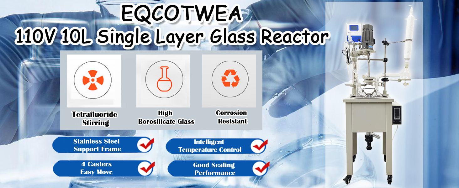 Stainless Steel Construction: 10L 110V Single Layer Glass Reactor is made of stainless steel frame and high borosilicate glass kettle body, ensuring excellent corrosion resistance and high-temperature endurance. This robust construction ensure the smooth progression of reactions.