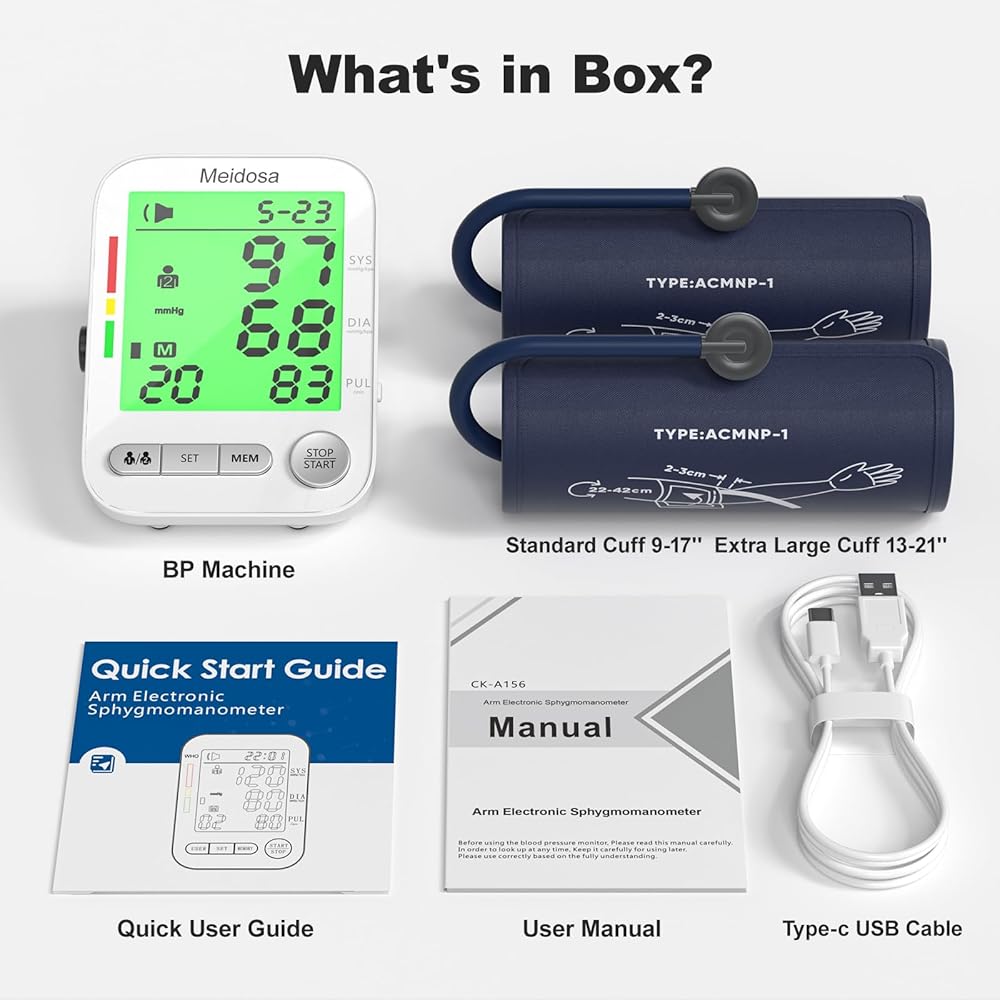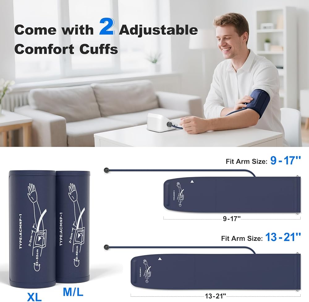 【2 Extra Large Adjustable Blood Pressure Cuffs】This blood pressure monitor comes with 2 sizes of upper arm cuffs, M/L cuff(9"-17") and X-Large cuff(13"-21"), which fits most arm circumferences and ensure comfortable use for users with different arm sizes. Wearing a cuff that fits your arm size ensures more accurate measurements. One blood pressure machine for the whole family