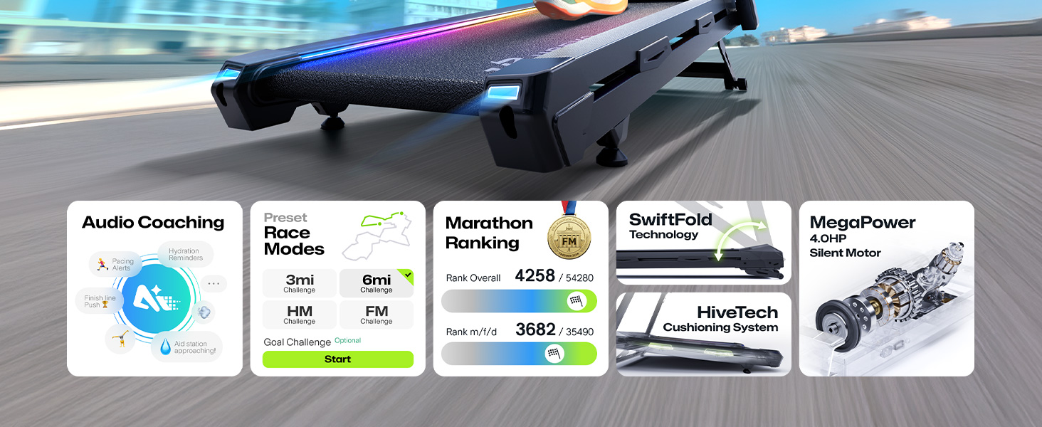 🦄【AI Smart Marathon Coach APP】Take your home marathon training to the real level with your target to Berlin or Boston Marathon. AI Coach APP guiding you through live voice updates on speed, distance, pace, and incline along the way. With the built-in HIIT Mode, you can push your limits for interval training while the system automatically records your progress. Elevate your marathon preparation with a coach that's always on hand to guide you every step of the way to improve your personal best.