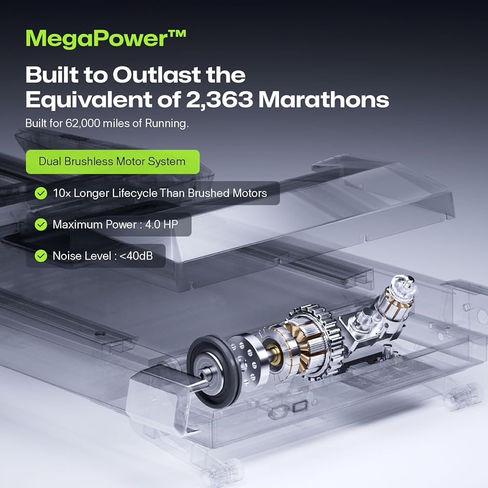 ⚡【Dual Brushless 4.0 HP Motor】CyberMega treadmill offers powerful performance and boasts a lifespan that is ten times longer than traditional brushed motors—ensuring durability for up to 620,000 miles of training. Which ensures you to finish 2363 full marathons training. With its low noise design, you can train without disruption, making it ideal for both home use and serious marathon preparation. This treadmill delivers unmatched performance and longevity that you can rely on for years to come.