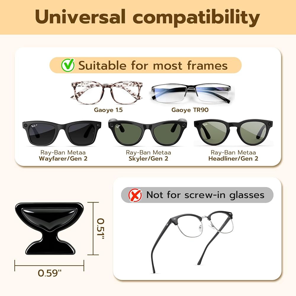 Universal Frame Compatibility: Universally compatible with RayBan Metaa Wayfarer/Skyler/Headliner. Whether you're working at a desk, hiking outdoors, or driving, the eyeglass nose pads keep your eyewear secure and comfortable