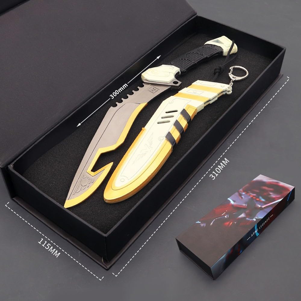 Bangalore Heirloom, hand-polished and handpainted. There are all the details you need for the Bangalore pilot knife. Made of metal, its raw material is zinc alloy, and it's full-sized with a 22cm/8.66" length and a 235g/8.28oz weight it's an amazing gift for Bangalore main Apex gamers It's the blunt blade, so it's very safe for cosplay and collection purposes, you don't need to worry about kids hurting themselves by accident