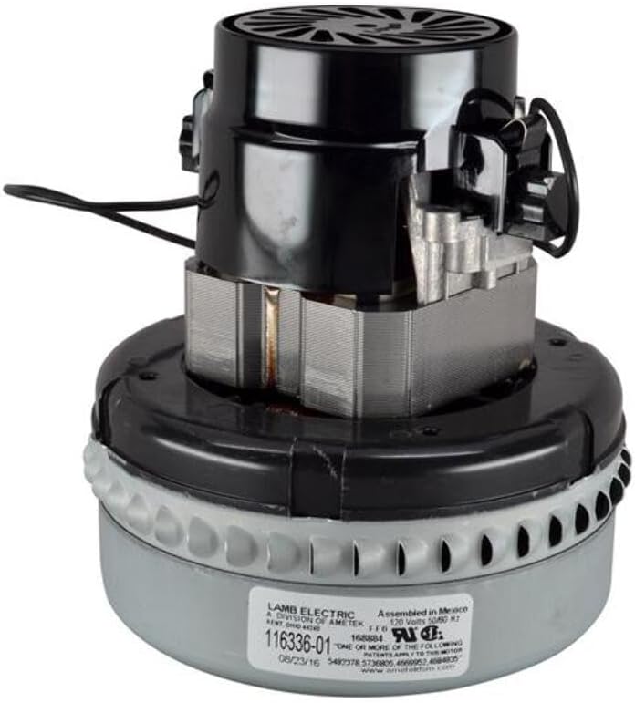 Vacuum Motor, Motor/Blower Type Thru-Flow, Discharge Thru-Flow, Blower Stages 2, Number of Speeds 1, CFM @ 2-In. Orifice 95.0, Vacuum (H2O Sealed) 91.2, Voltage 120, Hz 60/50, Phase 1, Max. Amps 8.2, Max. Air Watts 245, Thermal Protection None, Insulation Class A, Bearings Ball, Ambient Temperature 40 Degrees C, Body Dia. 5.7", Overall Height 5-9/16", Mounting Brackets Metal, Duty Intermittent, Average Life 500 hr., Efficiency Group Standard, Standards UL Recognized (E47185), CSA Certified (LR31393), Replacement Brushes Mfr. No. 833384-50