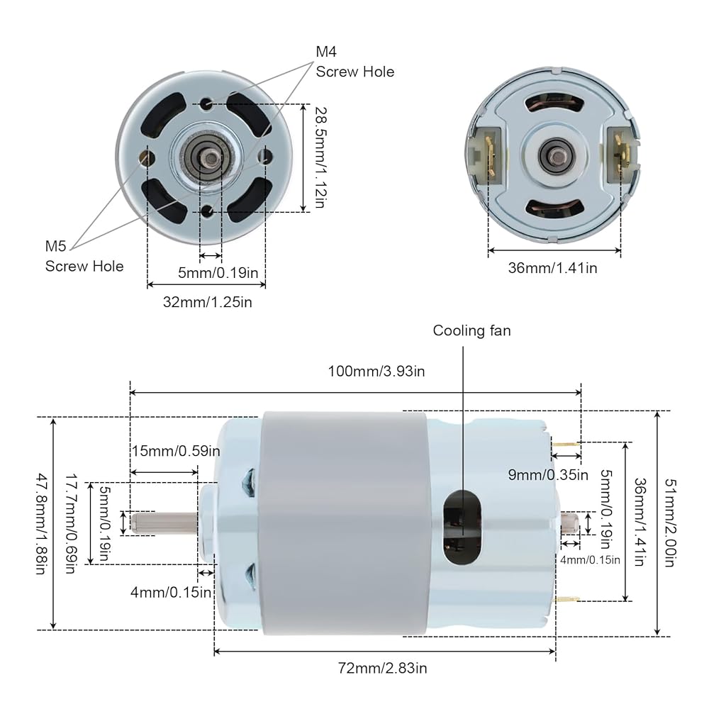 - Pure copper coil, with heat dissipation impeller, stable speed, strong continuous torque output, the torque is more than twice that of the 775 motor.