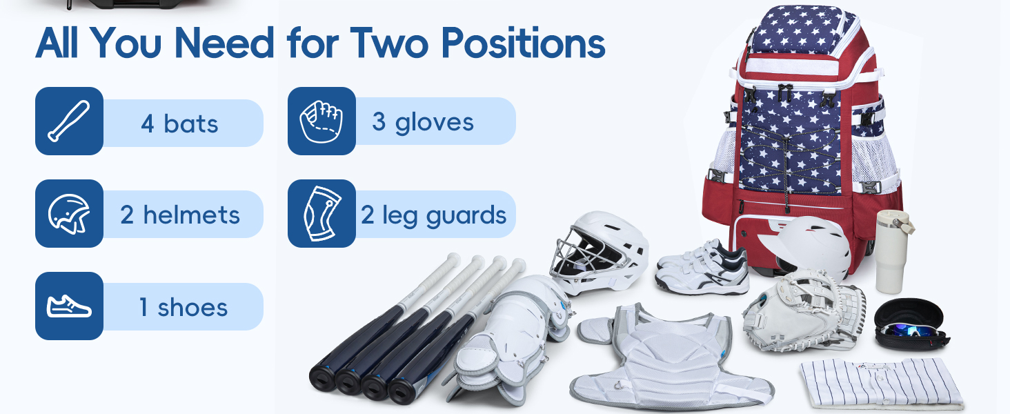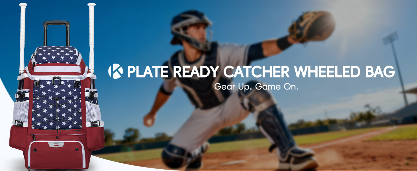 【PRO-GRADE CAPACITY FOR 2 POSITIONS】Designed for the serious player who needs maximum versatility, the Plate Ready Catcher Wheeled Bag effortlessly carries 2 complete sets of gear in its spacious 90L compartment, including 4 baseball bats, 2 helmets, a chest protector, 2-3 gloves, and leg guards