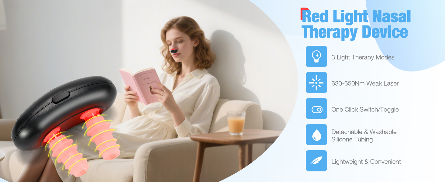 Red light nasal therapy device: Designed specifically for relieving sinus problems. It is equipped with 630-650nm weak laser, which deeply penetrates the nasal tissue, promotes blood circulation through photon absorption, effectively relieves symptoms such as nasal congestion and runny nose caused by acute and chronic rhinitis, sinusitis, etc., and deeply cleans the sinus passages