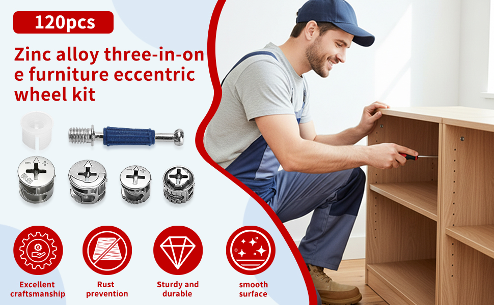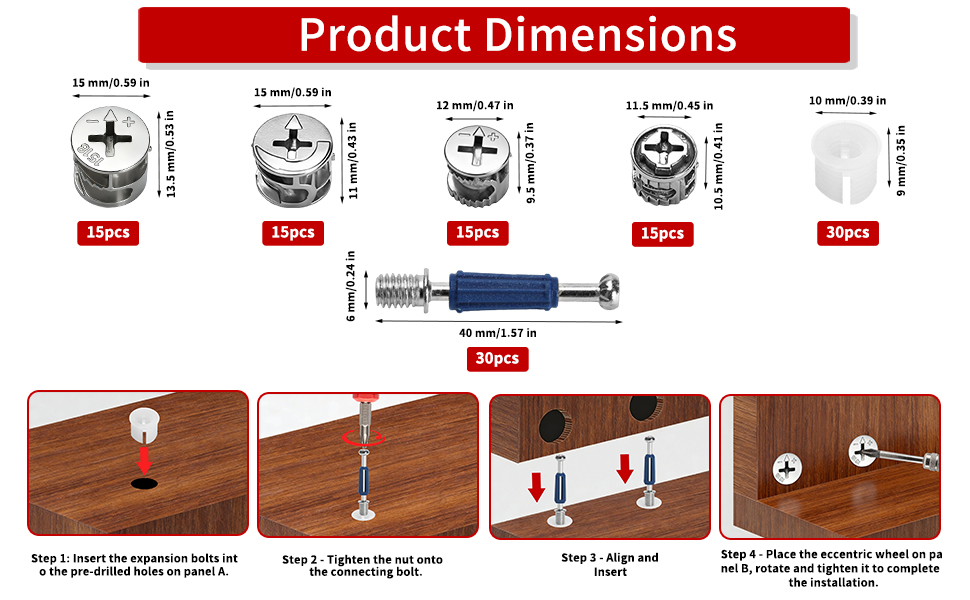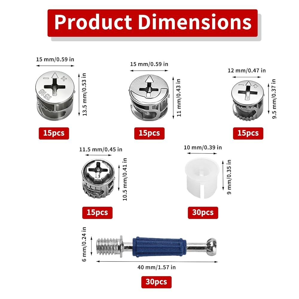 Package includes: This set contains 120 pieces: 15 PCS 12 x 9.5 mm cam nuts, 15 PCS 11.5 x 10.5 mm cam nuts, 15 PCS 15 x 11 mm cam nuts, 15 PCS 15 x 13.5 mm cam nuts, 30 M6 x 40 mm cam locking screws, and 30 expansion nuts, meeting a variety of needs.