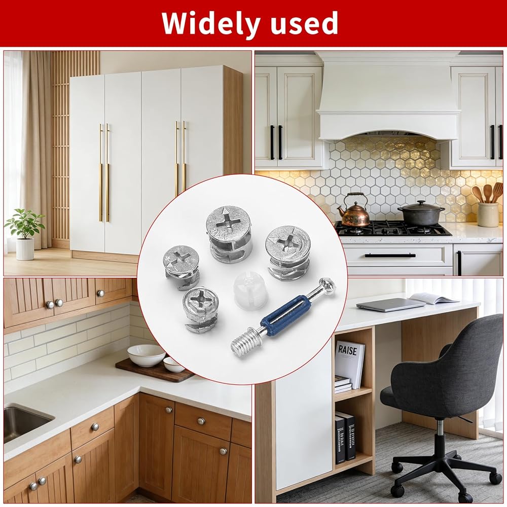 3-in-1 Fastener Set: This set includes a cam nut, cam locking screw, and expansion nut, forming a coordinated system. Each component is carefully designed to work together to create a secure connection after installation. Suitable for furniture repair, parts replacement, and woodworking requiring reliable connections.