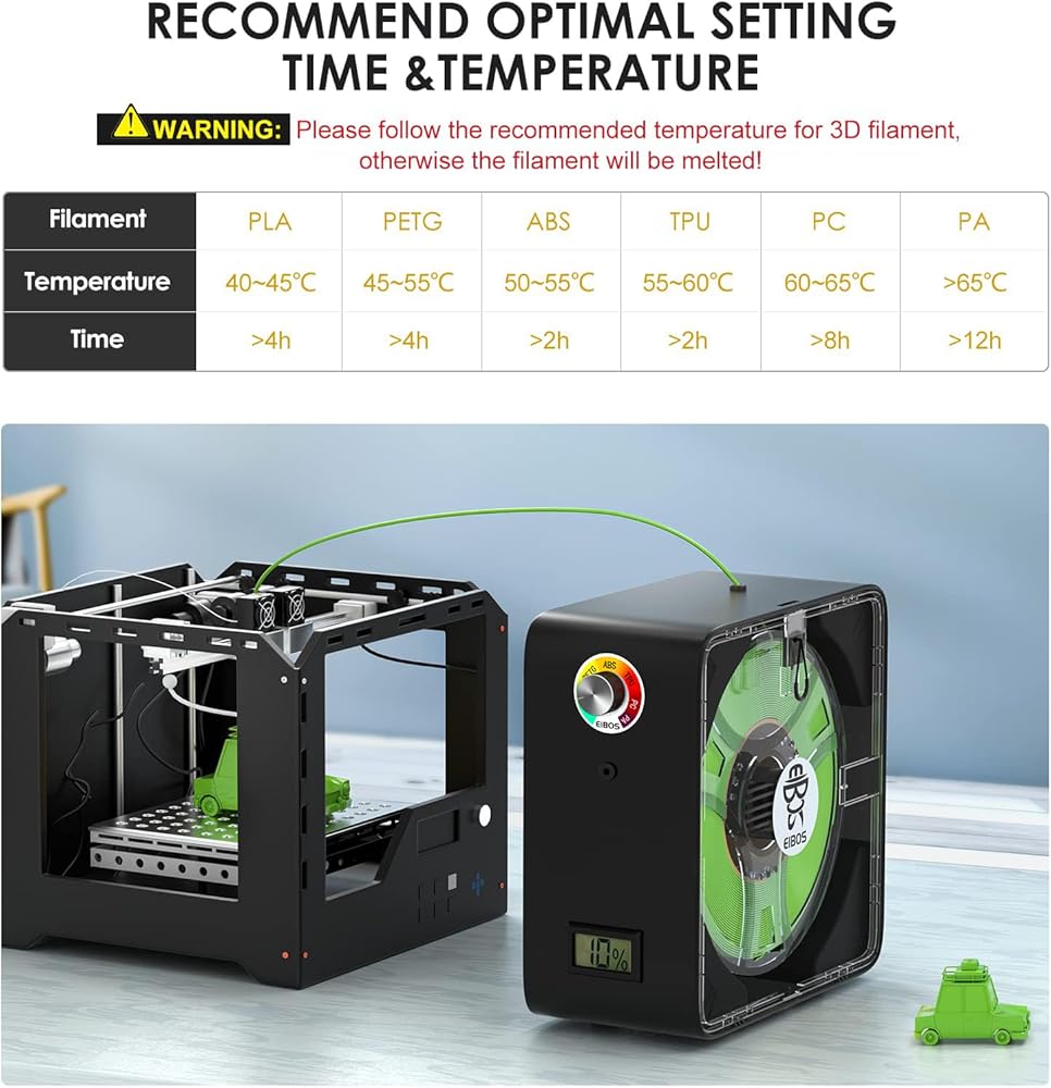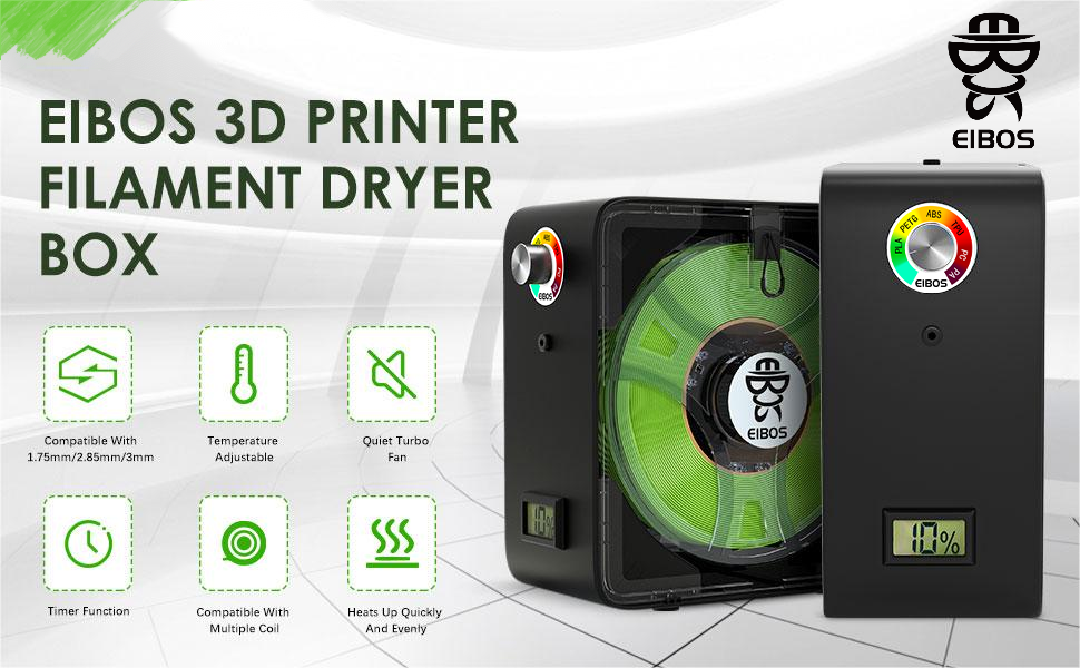 45W PTC HEATER & BUILT-IN FAN: different from applying ordinary heater 48W PI heating pad to heat up space, eibos easdry fialment dryer uses 45W PTC heater which is durable, energy-saver, and environmentally friendly, makes filament drying more evenly. Also a Built-in fan is designed to circulate the hot-air (the outside air is heated before being circulated ) inside the chamber to make drying system better remove the moisture