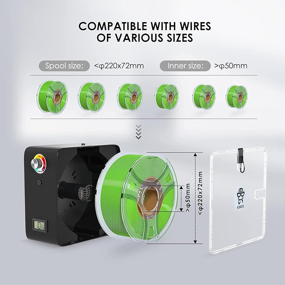 COMPATIBLE WITH MULTIPLE SPOOLS: works for different filament types and diameters, compatible with 1.75mm, 2.85mm, 3.00mm 3D filament such as Nylon, PLA, PVA, PC, TPU, PETG, PA, Wood, ABS, Silk, etc. Exquisite space allows usage of single roll with spool size: 220x72mm, Inner size: 50mm, with little rubber seals to fit around a PTFE tube, and smooth rotating shaft allows the filament to continuously rotate in a dry hot box to remove moisture