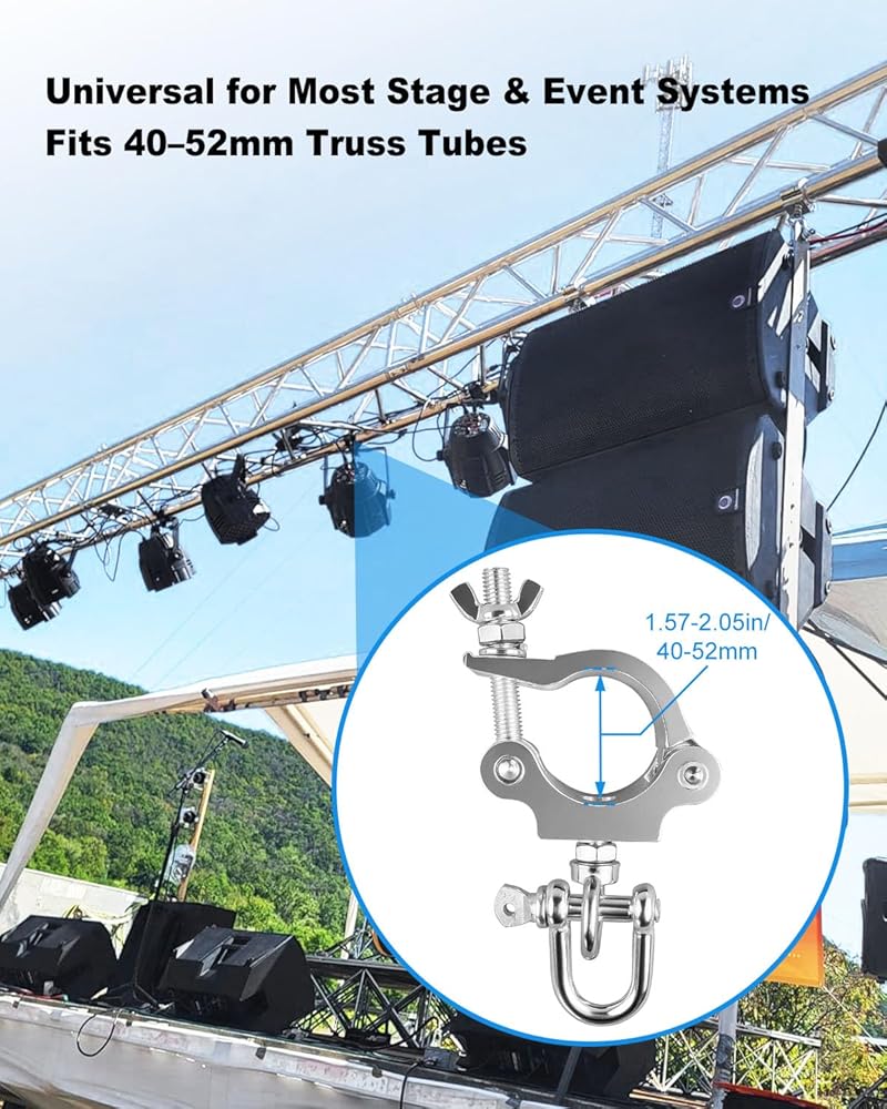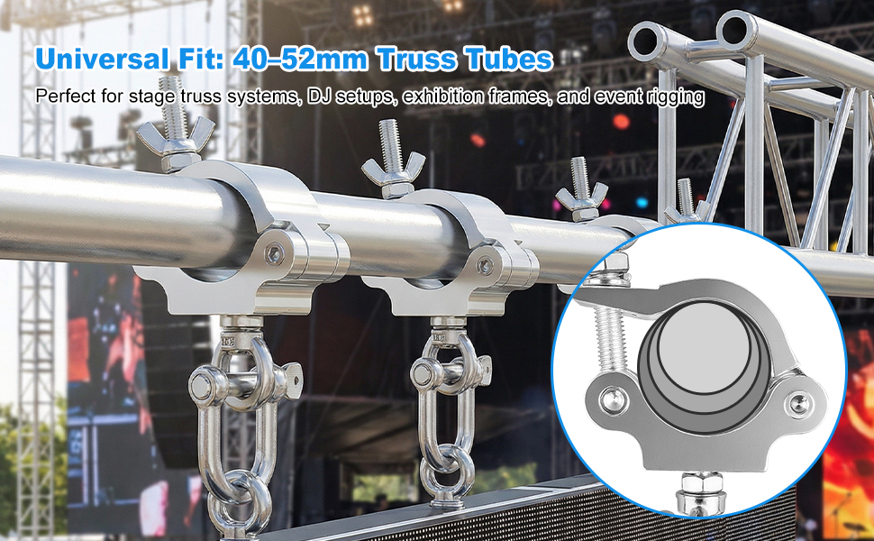 Fits 40–52mm Truss Tubes: Engineered for wide compatibility, the clamps securely fit round truss and pipe systems with an outer diameter of 40–52mm, making them suitable for most event, stage, and exhibition setups