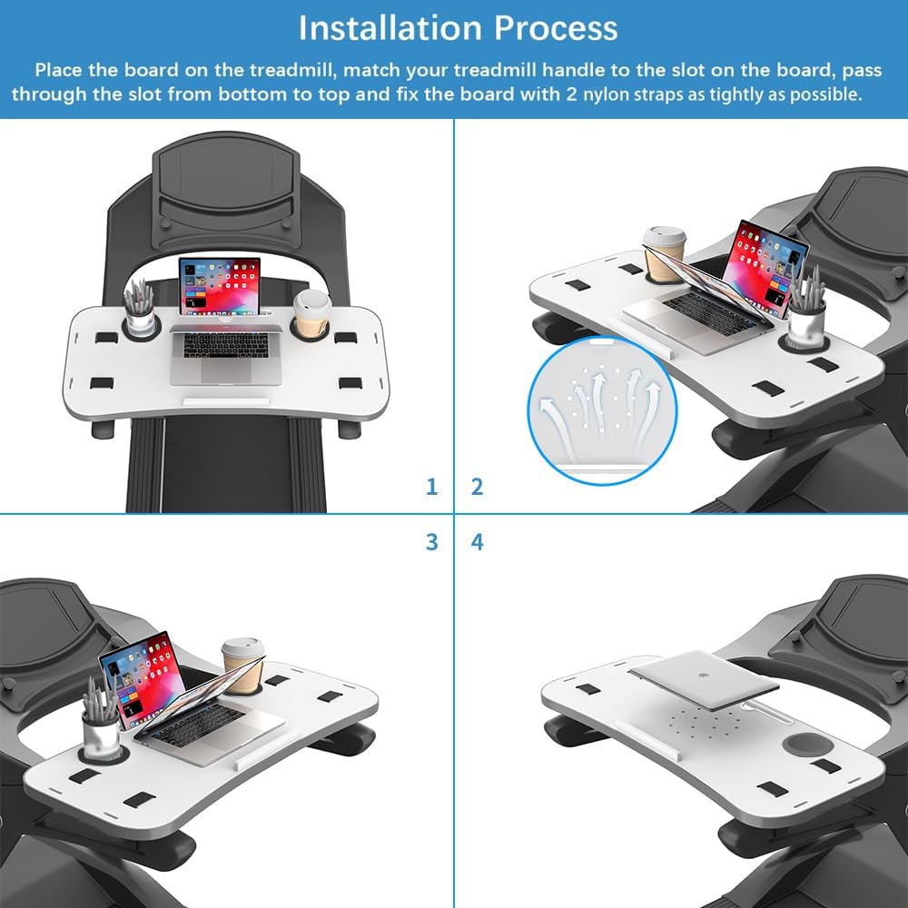 【EASY, TOOL-FREE INSTALLATION】Installs in minutes. Position the desk across the treadmill handrails and secure the upgraded dual straps in the closest slots for a firm hold. Fits most treadmills and stays in place while in use.
