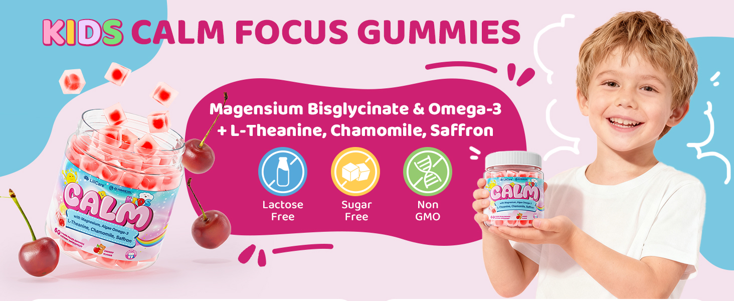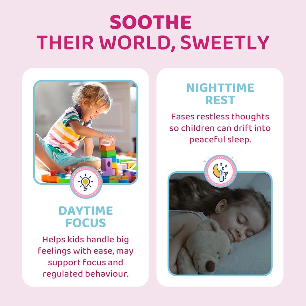 【Vegan & Sugar Free】Tasty gummy format makes it simple for kids to enjoy daily calming support without fuss. No added sugar, naturally sweetened with stevia and monk fruit extract, making it friendly to children's teeth. Free from GMOs, preservatives, artificial colors, dairy, soy, eggs, nuts, gluten, and gelatin.