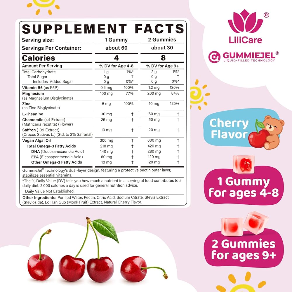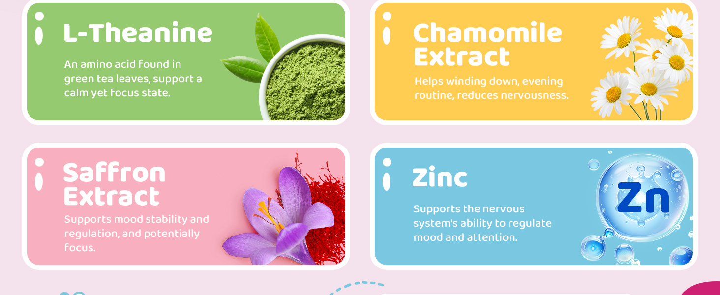 【L-theanine Chamomile Saffron Gummies】Gentle, kid-friendly ingredients help children relax with ease. L-theanine encourages a calm yet focused state, while saffron and chamomile provide natural soothing support that promotes a cheerful daytime mood and more restful sleep at night.