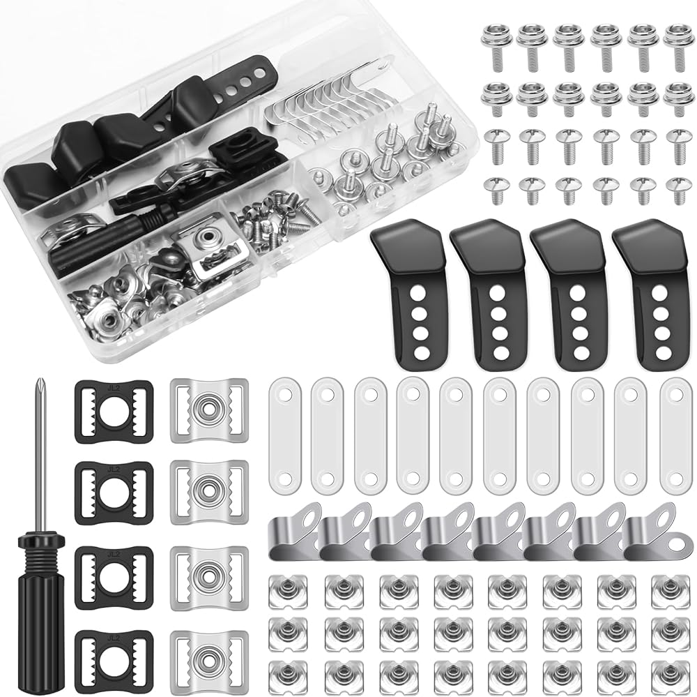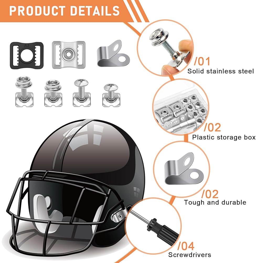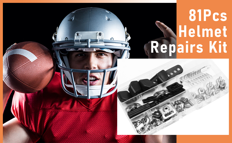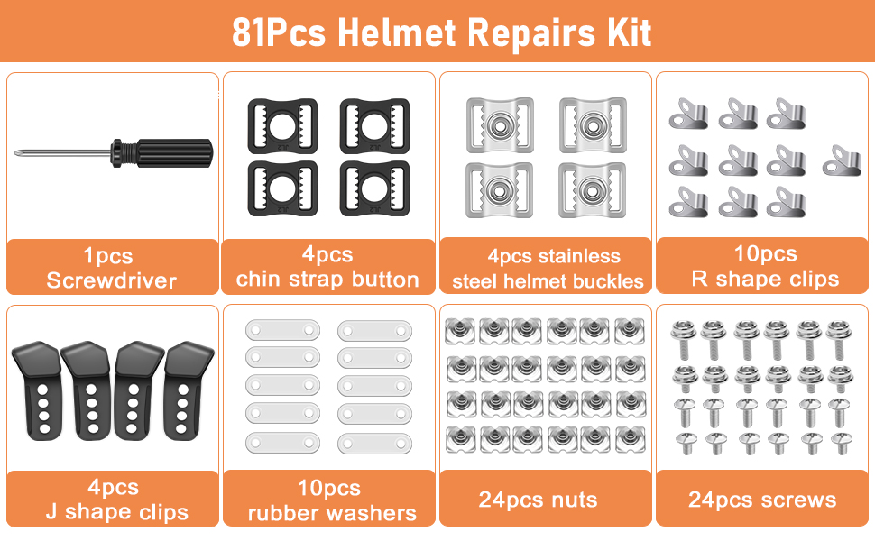 Package Include:81Pcs football helmet repair kit include 2 pair of plastic J shape clips, 10 aluminum R shape clips for football visors, 10 rubber washers, 24 nuts, and 24 screws (6 screws of 10mm length, 6 screws of 6mm length, 6 screws of 12mm length with a female end, and 6 screws of 5mm length with a female end). The kit also contains 4 black plastic chin buttons, 4 stainless steel helmet buckles, and 1 screwdriver, totaling 81 pieces, enough quantity to repair or replace
