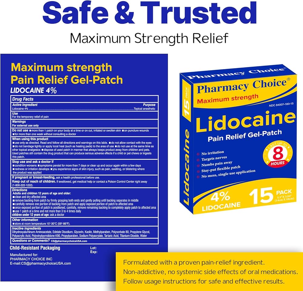 Maximum Strength: 4% Lidocaine Gel Patches provide quickly , deep, and temporary relief for sore muscles in your back. neck , arm , leg,and hip, and joint in your knee, shoulder.