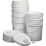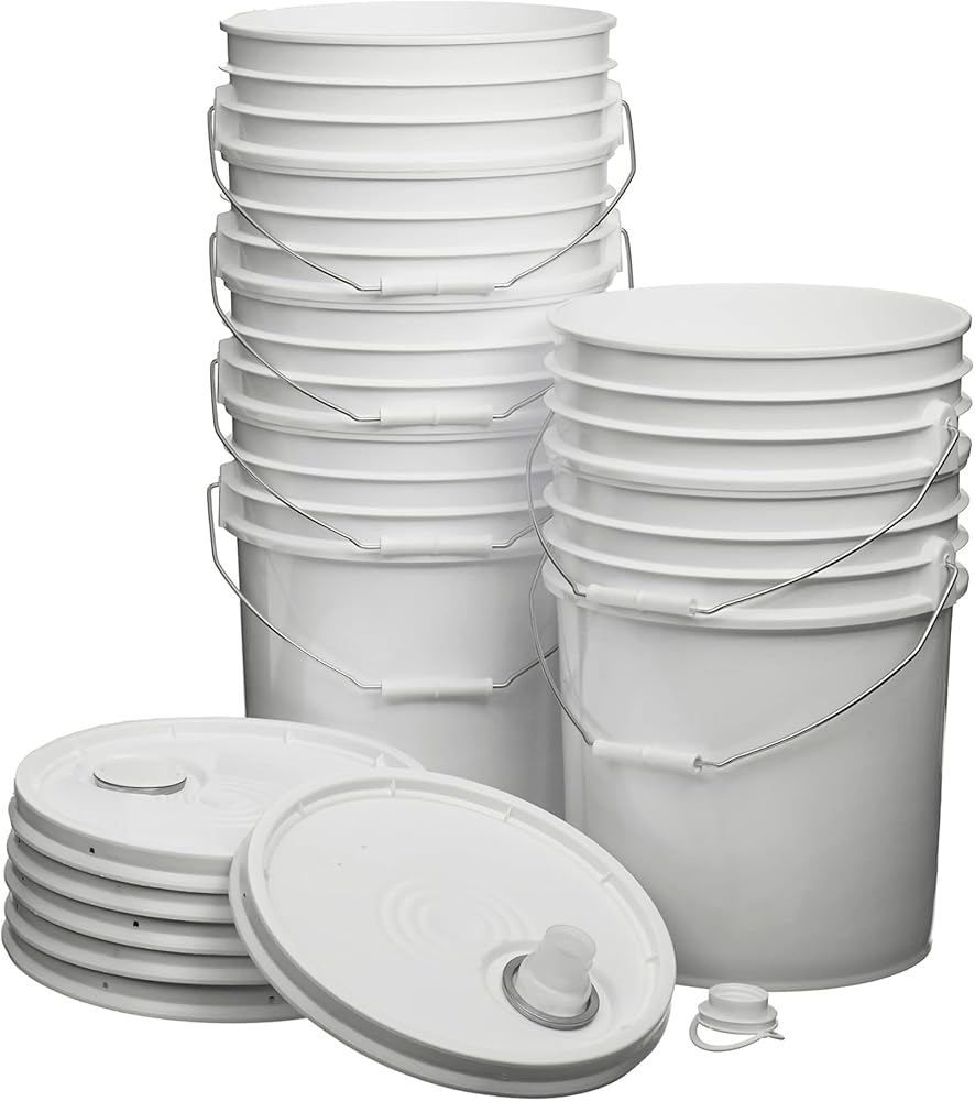 These 5 gallon hdpe buckets are extremely tough. 90 mil construction allow for these buckets to be used over and over again. Sturdy wire bail with a plastic handgrip is attached to the bucket. Practical fill is 5.10 gal. (19.30 liters) and overflow fill is 5.40 gal. (20.44 liters). Meets standards. Rieke lid included. Six pack, item contains six buckets and six lids. Rubber mallet required to install lid.