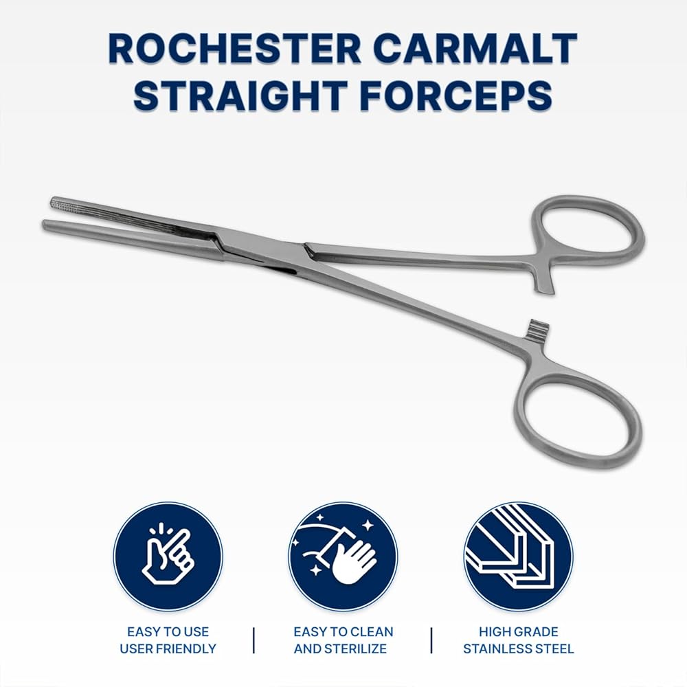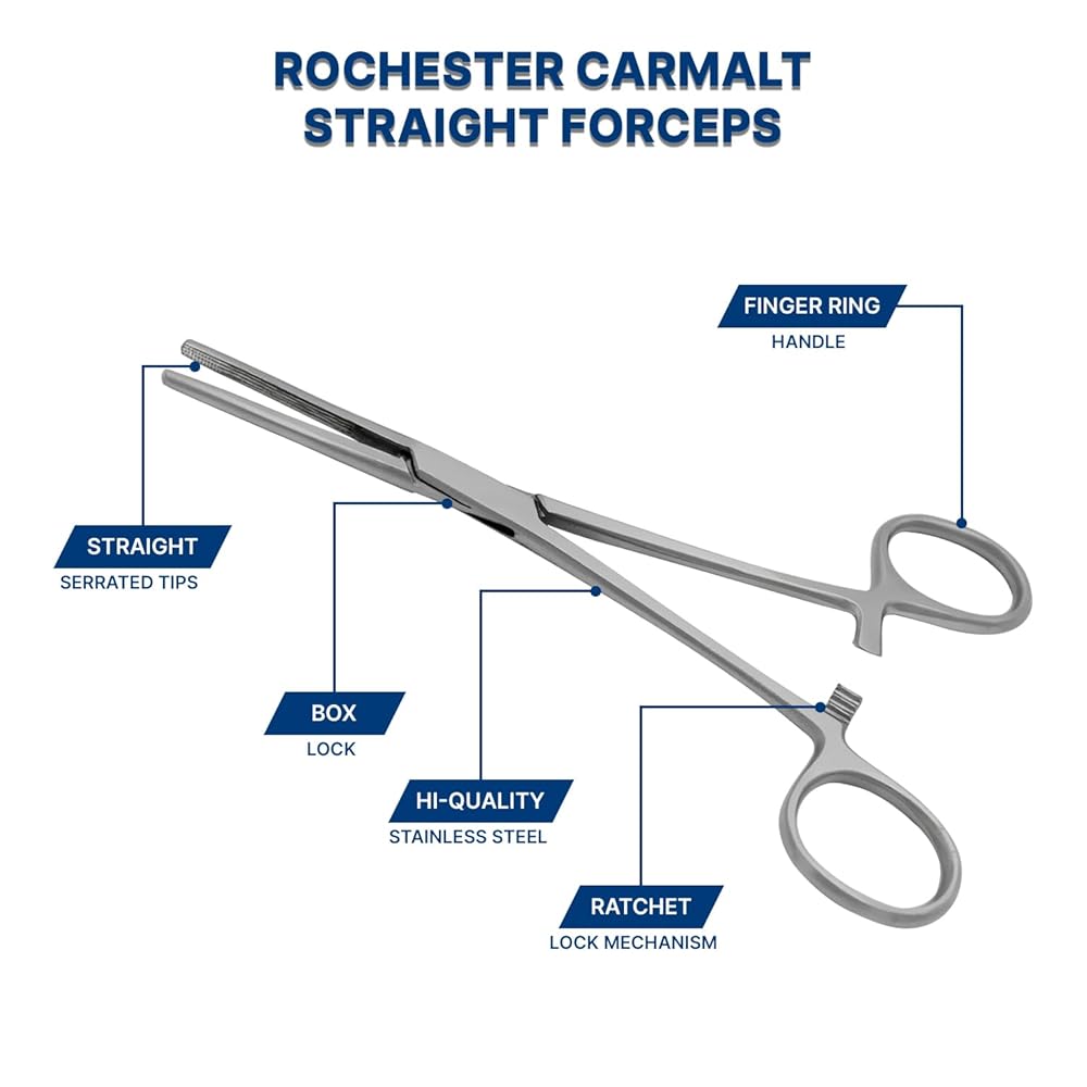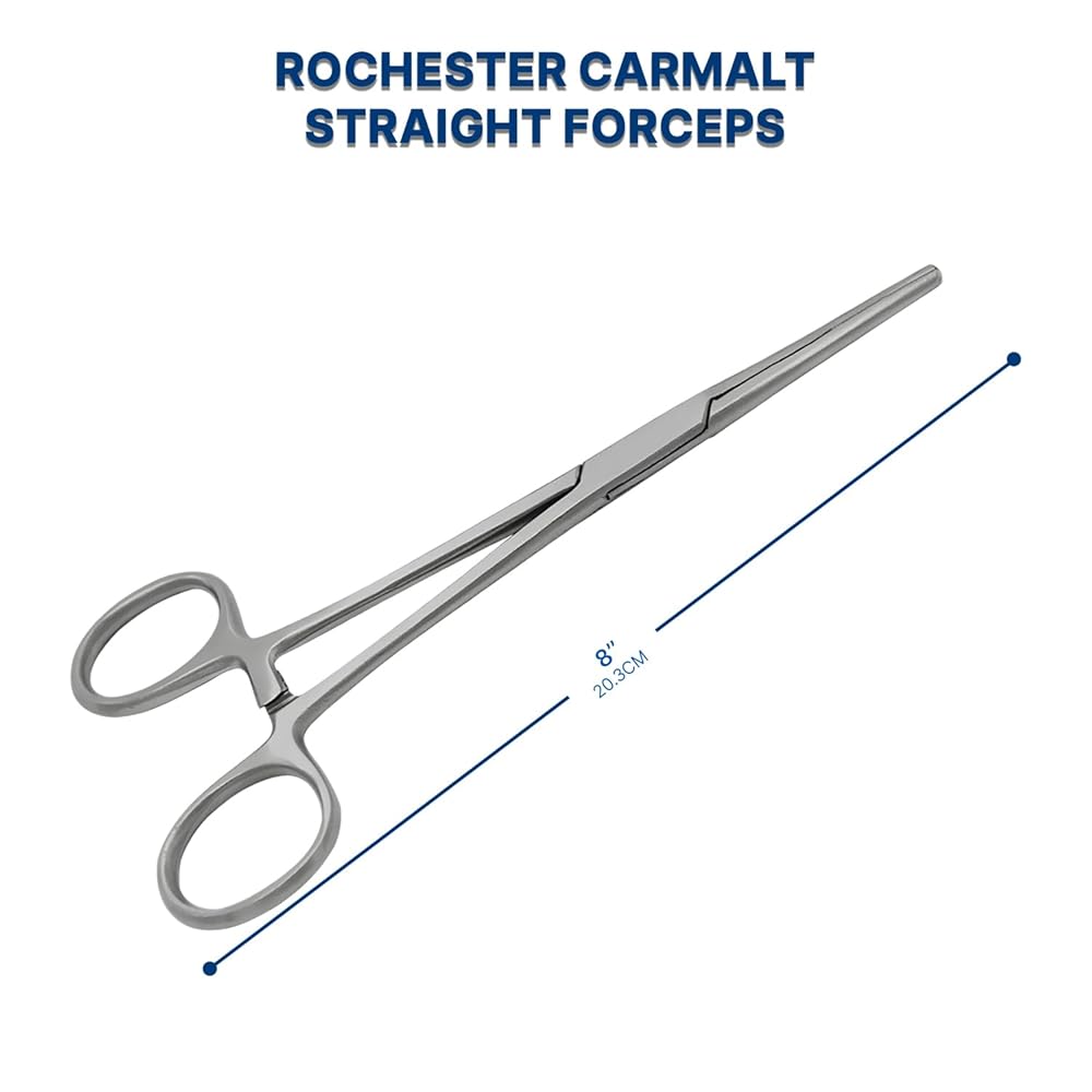 Rochester Carmalt Hemostat Artery Forceps with Cross Serrated and Longitudinal Grooved Jaws The Rochester Carmalt Hemostat Artery Forceps are surgical instruments designed for clamping blood vessels or tissues during surgical procedures. These forceps feature cross-serrated jaws, which provide a secure grip on tissues, and longitudinally grooved sections for added control and precision. The cross-serrated pattern ensures that the instrument can hold tissues or vessels firmly in place, minimizing the risk of slippage during surgery. Key Features: Two Common Sizes: Available in 6.25" and 8" lengths to suit different surgical needs. German Grade Stainless Steel: Constructed from high-quality stainless steel, ensuring durability, corrosion resistance, and long-lasting performance in the operating room. Cross-Serrated Jaws: The cross-serrated design offers superior gripping power for vascular control. Longitudinal Grooves: These grooves enhance stability and control over the tissues or vessels being clamped. These hemostat forceps are commonly used in procedures where secure hemostasis is required, such as in vascular surgery or tissue dissection. The ergonomic design and high-quality material make them a reliable choice for medical professionals.