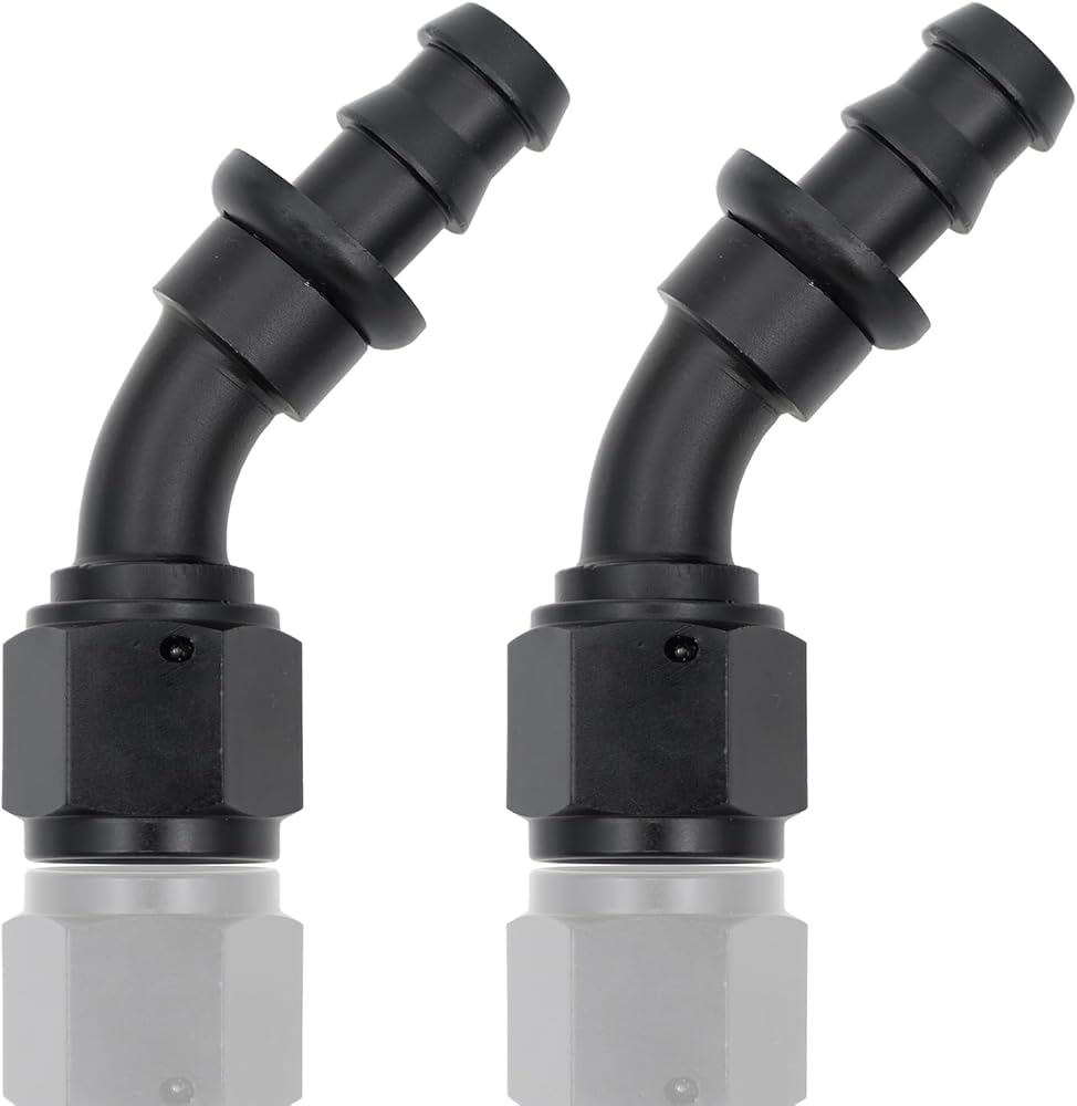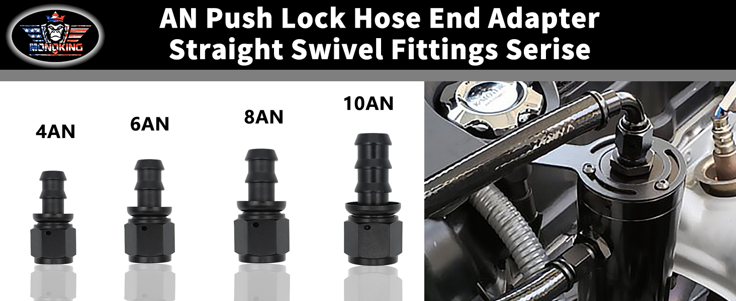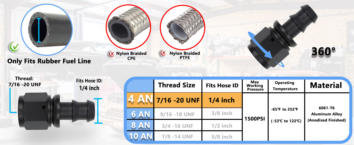 FITMENT: 4AN Push Lock Hose Barb Fitting, Fits 1/4'' ID Rubber Fuel Line. The Thread Size: 7/16-20 UNF, Fits Hose ID: 1/4 inch. Max Working Pressure: 1500PSI, Operating Temperature: -40℉ to +248℉ (-53℃ to +122℃)