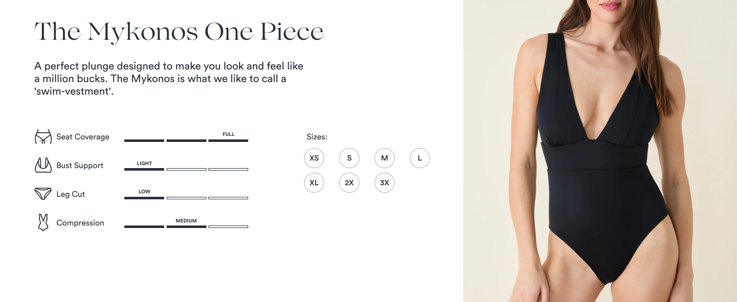 Confident Coverage: Designed for lift, shape, and all-day confidence. The Mykonos features a deep plunge neckline balanced by cheeky seat coverage and a low leg cut for a sculpted, sun-ready silhouette. Thick straps, contoured style lines, and a supportive underbust band provide security and comfort, whether you're poolside or on the go.
