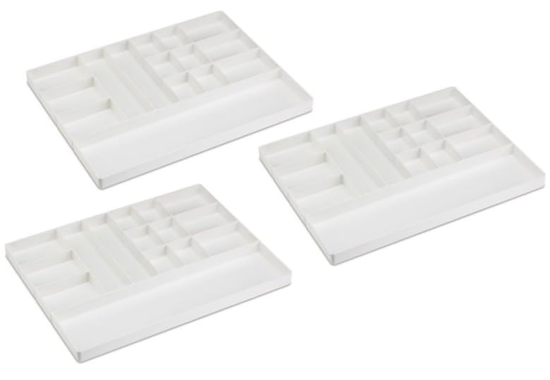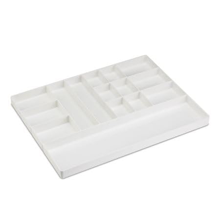 Drawer Organization Tray 3/Pieces. White. Four configurations of drawer organizers offer flexible custom solutions for various storage needs Keep all of your supplies and small components tidy, organized, and easily accessible with Drawer Organization Trays. White, high-impact polystyrene with rounded corners. Tray Size: 16"W x 12-3⁄16"D x 1"H