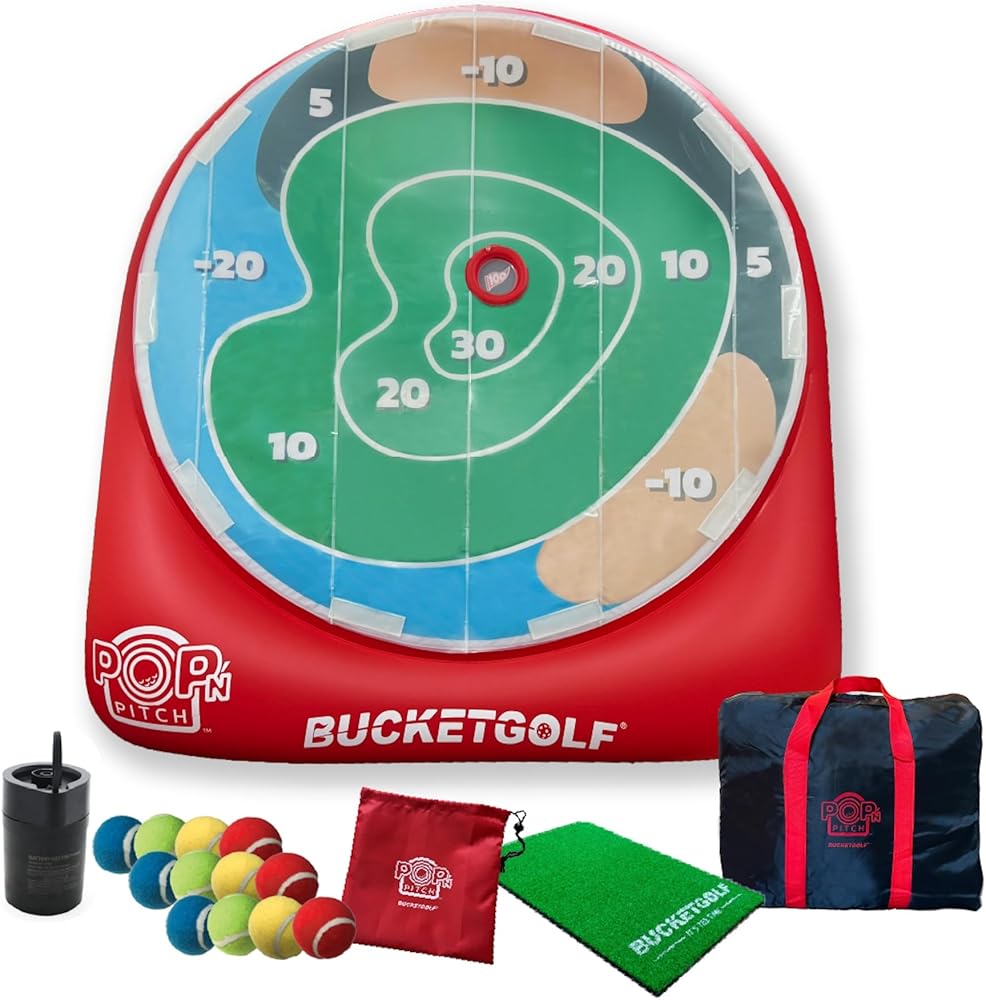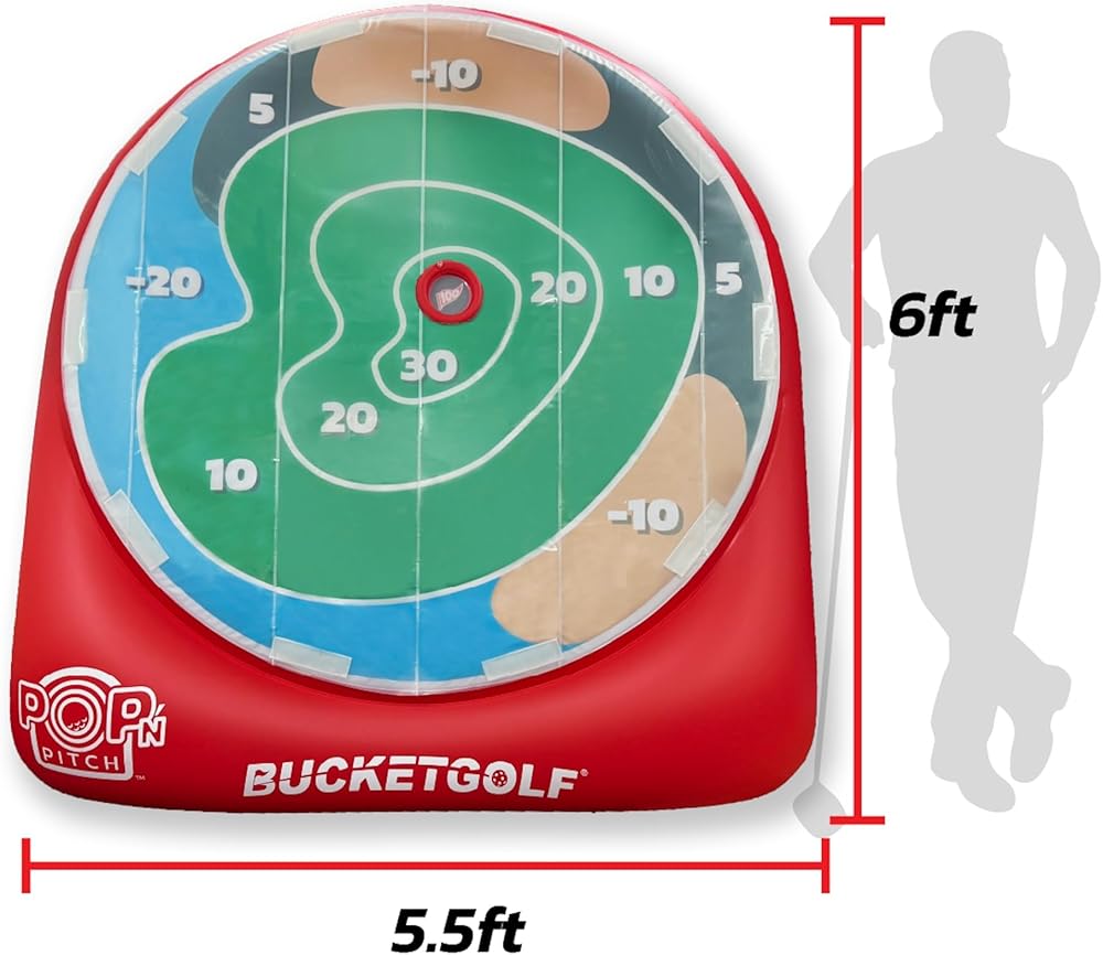 Bring the golf course anywhere with the BucketGolf Pop-n-Pitch Inflatable Target Game. Pop-n-Pitch sets up in minutes and transforms backyards, living rooms, garages, or tailgates into a fun golf challenge. The inflatable mat features a printed green and a movable bullseye so you can adjust the difficulty and keep each round engaging. Lightweight and portable, it packs into a compact bag and comes with an air pump for quick setup. Perfect for practicing short-game accuracy or entertaining friends, Pop-n-Pitch offers hours of play indoors or outdoors. Designed by a small team passionate about making golf more social and accessible, every set is built to help you enjoy golf anywhere.