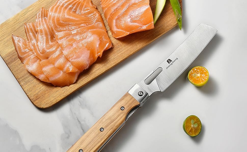 FUNCTIONAL: Folding and comfortable small chef's knife, perfect for outdoor cookouts, barbecues, fishing, hiking, and even cooking delicious food at home. This chef knife can be folded and even put into the pocket for easy storage and carrying.