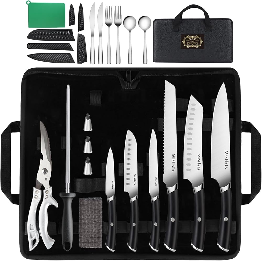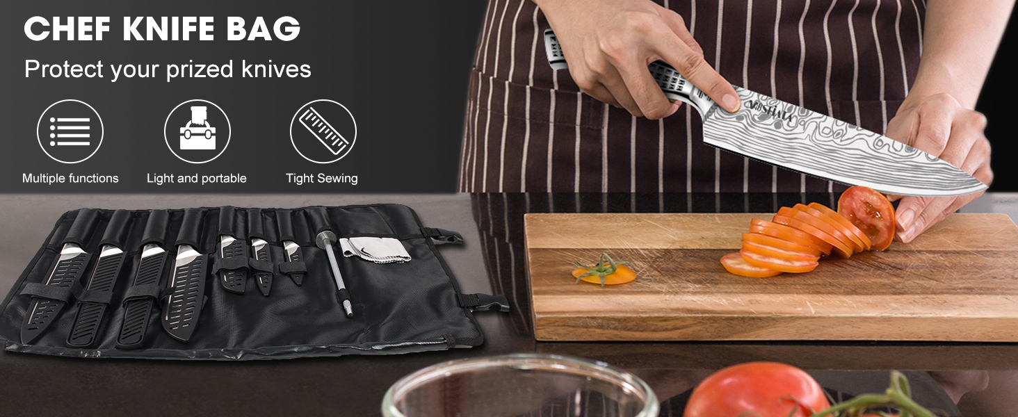 12-PIECES KNIFE SET: This knives set for kitchen includes:8” chef's knife, 7” Santoku knife, 5”Santoku, 8”bread knife, 8”carving knife, 5”utility knife, 3.5” paring knife, 8”stainless steel knife sharpening rod,finger guard *3, large wipe.Knife Sheath *6,Oxford cloth storage bag