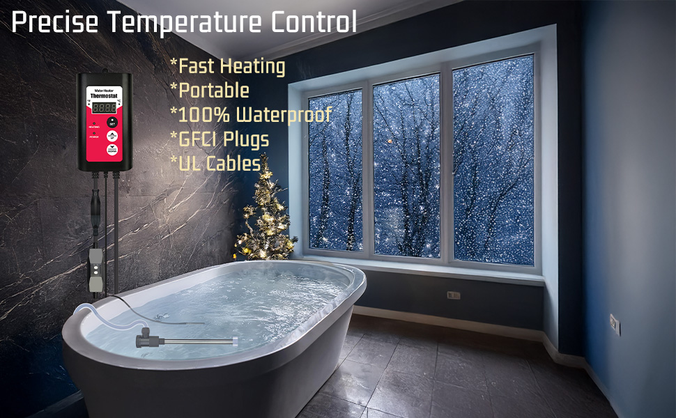 Portable & Widely Applicable: This portable water heater is designed to quickly heat liquids in a wide range of environments, including hot tubs, bathtubs, swimming pools, inflatable pools, baptismal pools, baptistries, inground pools, above-ground pools, swim spas, ponds, aquariums, kitchen sinks, and livestock water troughs. It works efficiently as a submersible water heater, immersion heater, pool heater, hot tub heater, and pond heater, making it ideal for both indoor and outdoor use. It can also function as a submersible heater, water tank heater, or pond heater with thermostat, suitable for various applications such as a cattle water heater or livestock water heater.