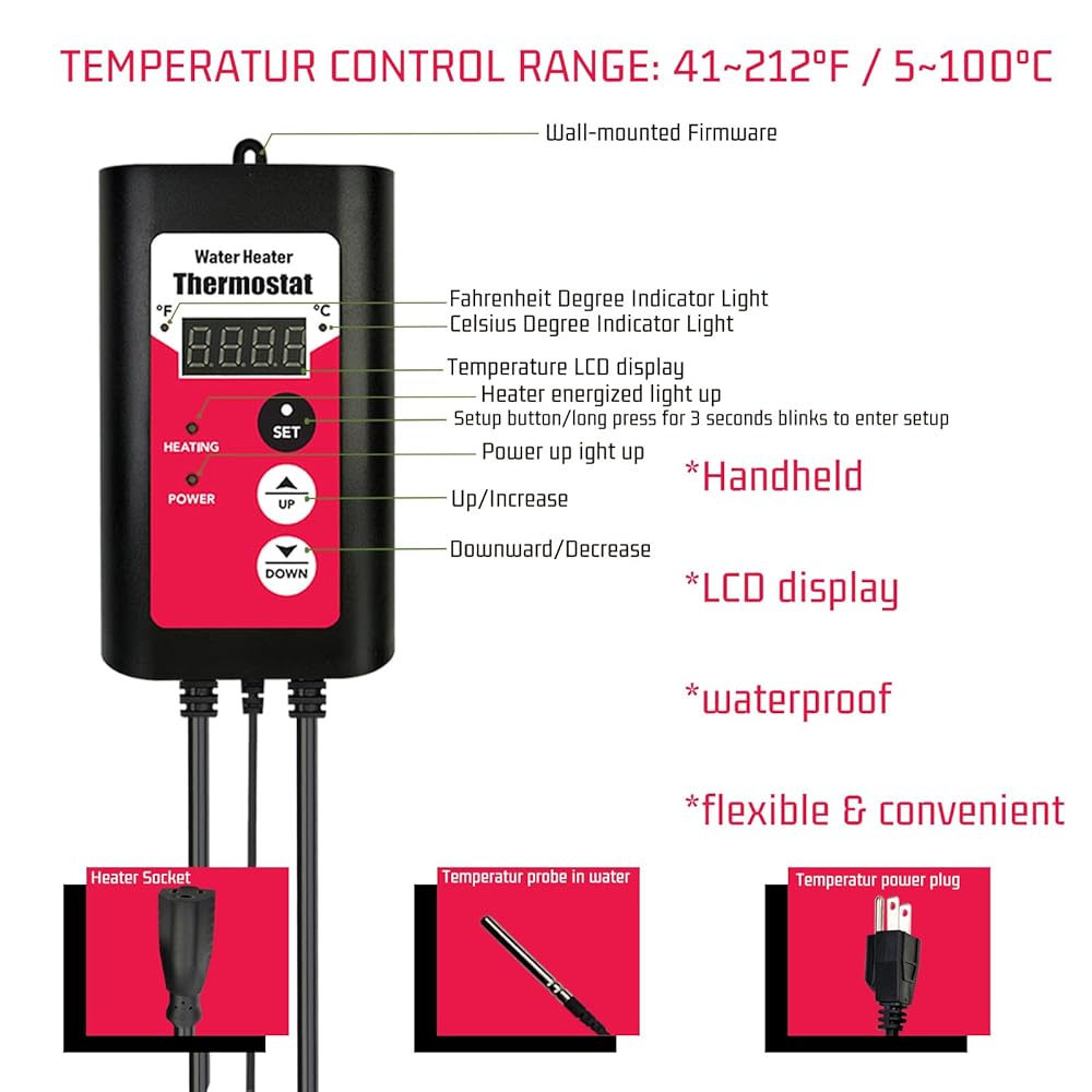 Precision Thermostat & Easy to Use: Equipped with a temperature probe that's the same length as the heater cable—118 inches—this thermostat immersion heater is perfect for situations where the socket is far away. The thermostat maintains precise temperature control within ±0.1°C. It's easy to use: simply press and hold SET for 3 seconds to adjust the temperature using the up and down buttons. The heater offers both Fahrenheit and Celsius options and comes with a detailed manual for proper usage.