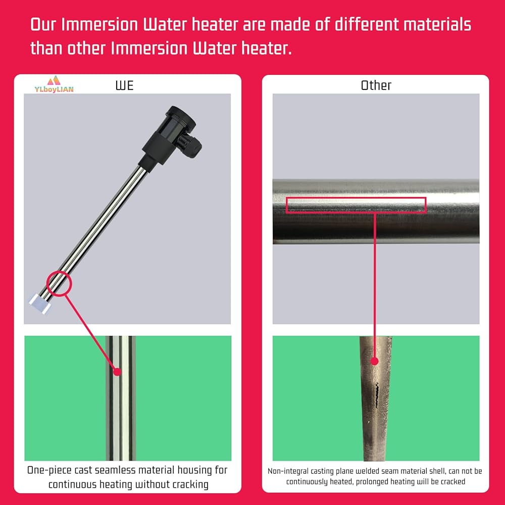 100% Waterproof Design with Double Insulation: The cable uses insulated rubber material that does not conduct electricity even when in direct contact with water. Additionally, an extra silicone protective sleeve is applied to prevent prolonged water immersion damage. Unlike standard immersion heater designs, this upgraded immersible water heater features dual insulation, significantly reducing the risk of electric shock during use.