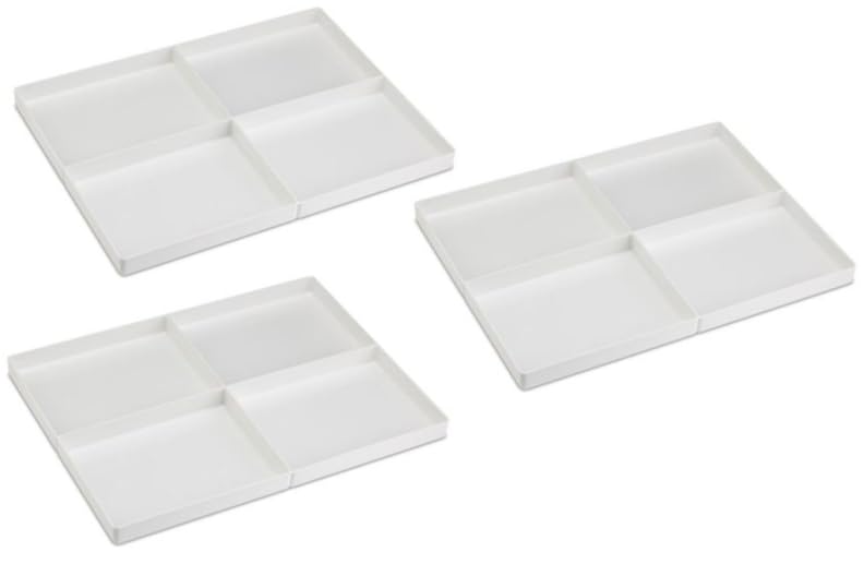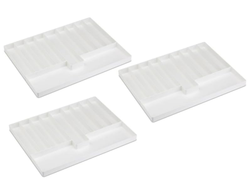 Drawer Organization Tray 3/Pieces. White. Four configurations of drawer organizers offer flexible custom solutions for various storage needs Keep all of your supplies and small components tidy, organized, and easily accessible with Drawer Organization Trays. White, high-impact polystyrene with rounded corners. Tray Size: 16"W x 12-3⁄16"D x 1"H