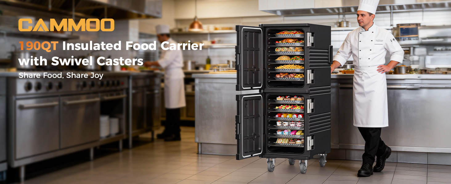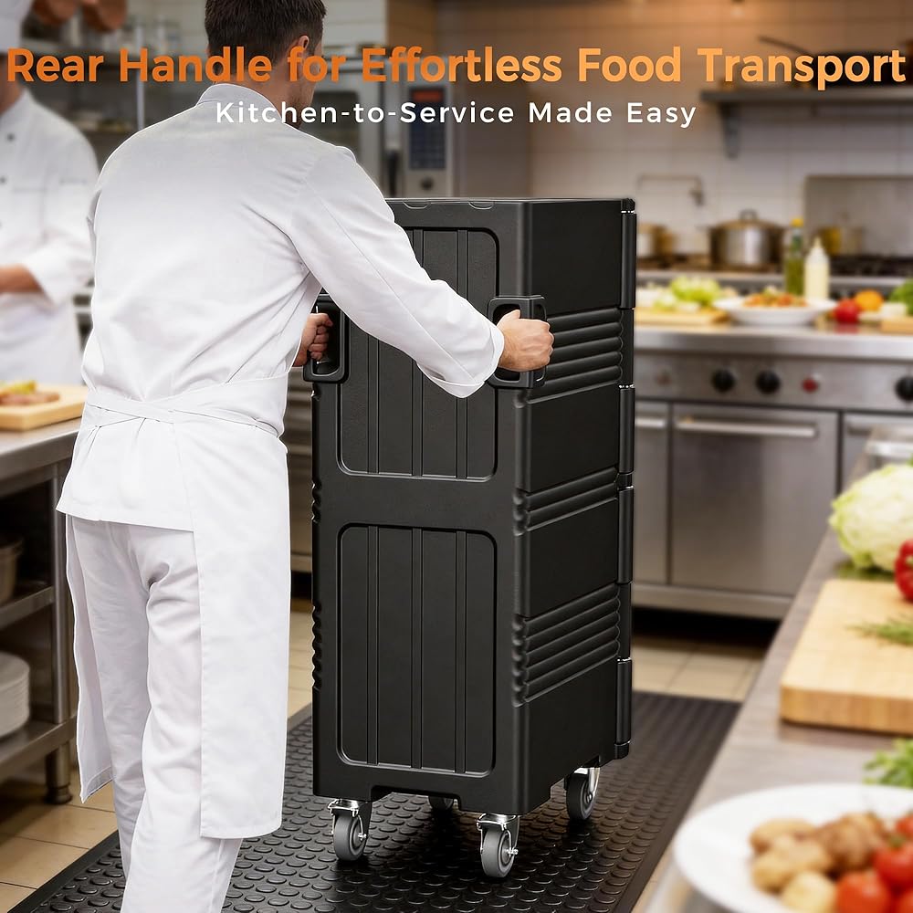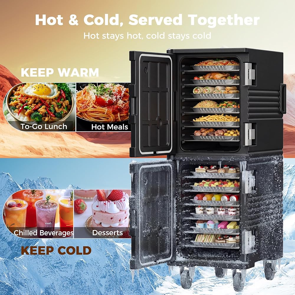 PROFESSIONAL CAPACITY – 190QT holds 12 full-size (1/1) food pans across two zones. Industry standard: 1 full pan serves 12-15 entrees—supports 150-200 person events. Ideal for restaurant delivery, catering, institutional food service. Front-loading 270° door access. No cords.