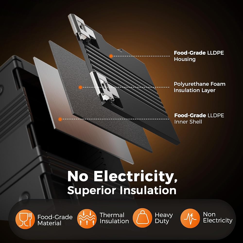 DOUBLE-WALL FOOD-GRADE CONSTRUCTION – Double-layer LLDPE (interior + exterior) delivers superior insulation over single-layer designs. Seamless roto-molded build eliminates residue traps. High-density foam core maintains safe temperatures for 4-6 hours. Selected for commercial food contact safety.