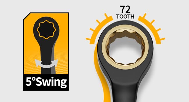 72-Tooth Ratcheting Mechanism:Ratchet wrenches set 72 tooth ratchet need only 5 degree working swing arc, suitable for tight space. 12-point full-drive box end offers firmer grip and more reliable torque to tighten and loosen any bolt or nut easily and more effortlessly without rounding