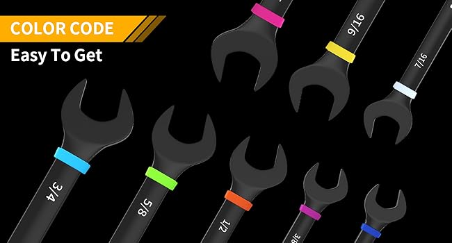 Complete 9-Piece Wrench Set: Sae wrench set include 1/4", 5/16", 3/8", 7/16", 1/2", 9/16", 5/8", 11/16", 3/4" +1pc bolt gauge.Each wrench has clear size and color ring identification rings for quick and accurate hand tools selection during any repair job.Ratcheting wrench set is forged from high-quality chrome vanadium steel, black electrophoretic paint after phosphating blackening, has excellent rust and corrosion resistance. The wrench hardness up to HRC 62 makes the wrench able to bear more force