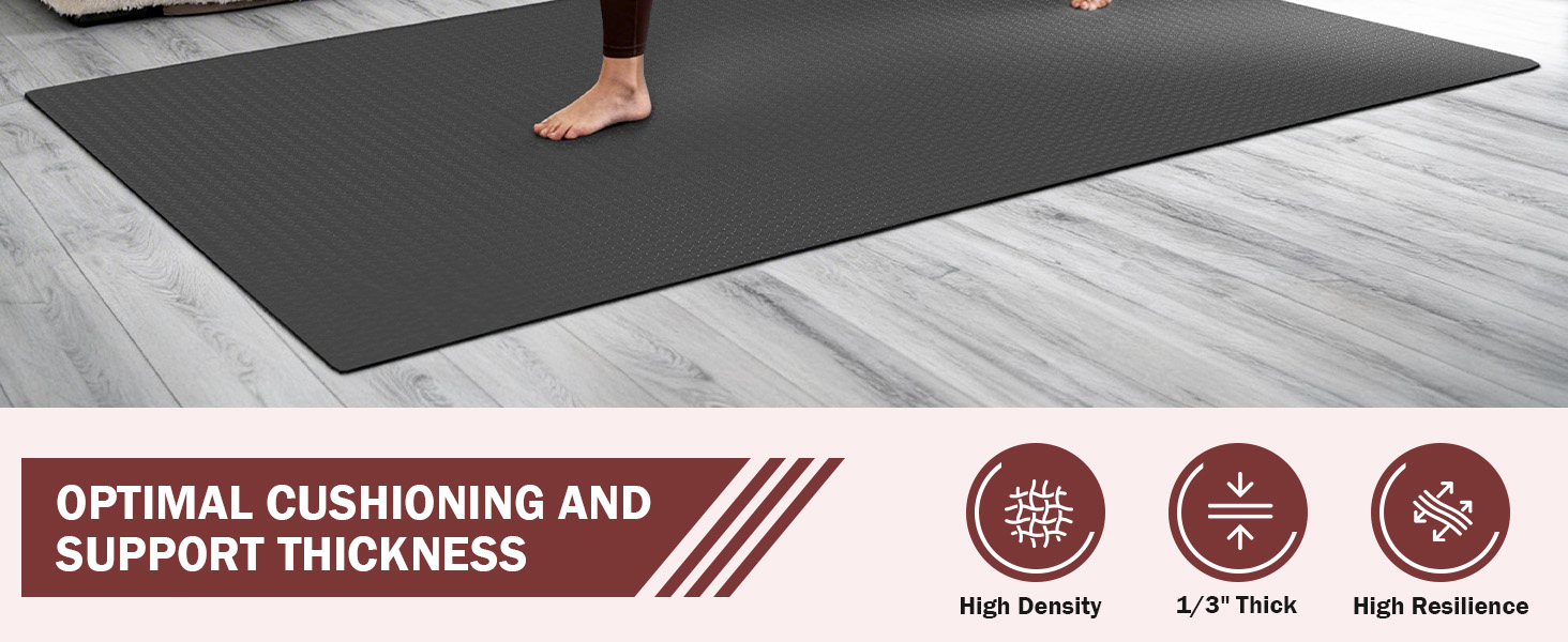 【Extra Cushion & Comfortable】 Made with high-density foam, our 6mm (greater than 0.25") thick large yoga mat offers superior shock absorption and joint protection, especially during high-impact training. Whether you're doing squats, lunges, or stretching, it reduces pressure on your knees, wrists, and elbows while providing a stable and comfortable surface. It also helps reduce noise and protects the floor.
