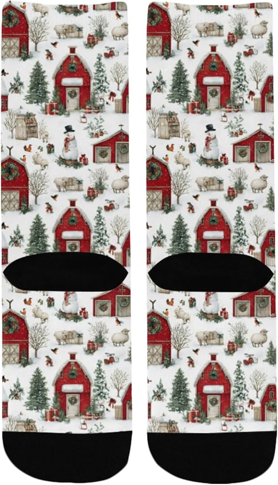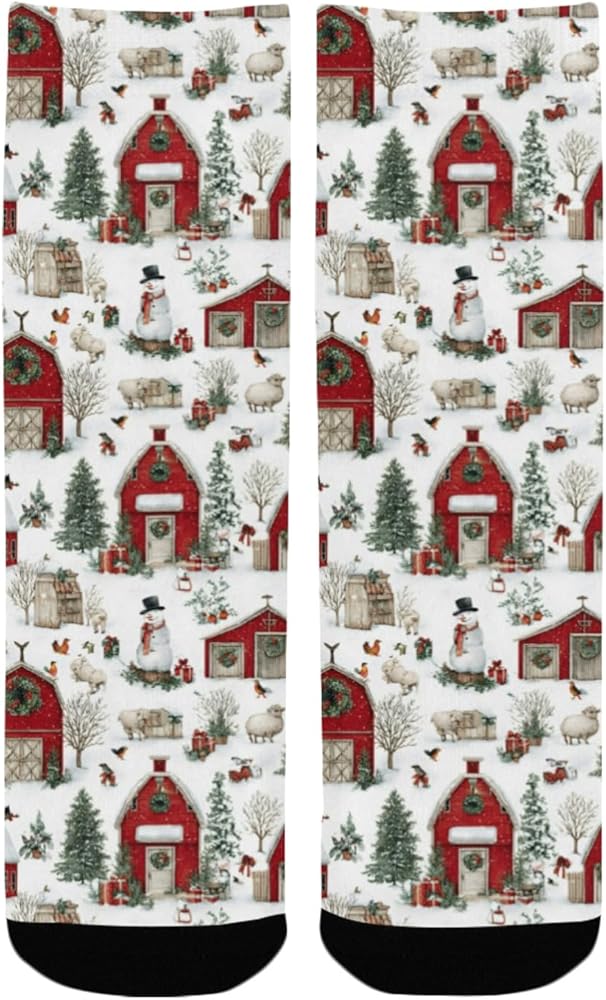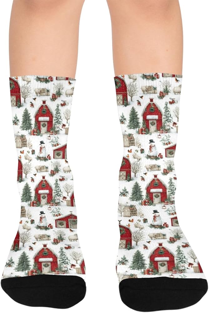 OTVEE Christmas Farm, Red Barns And Snowy Hiking Socks for Kids Boys Girls, 1 Pairs Breathable Soft Cozy Crew Boot Socks for Athletic Sport Basketball Daily Wear
