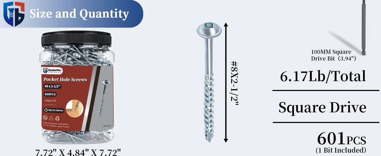【Portable Package】: 600Pcs Zinc Pocket Hole Screws #8 x 2-1/2" and a free 100MM Square Drive Bit. Easy to use. Goobetter Pocket Screws are packed in a sturdy container for convenient storage and use with clear label